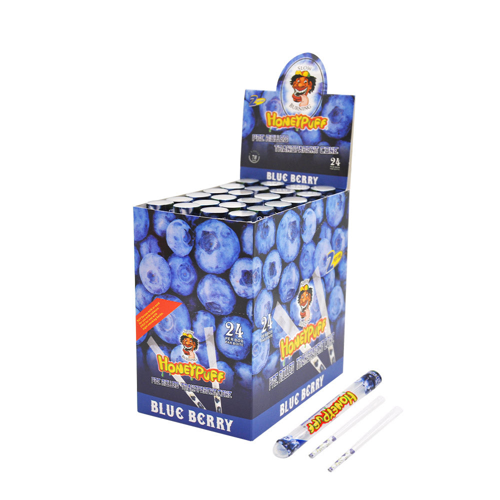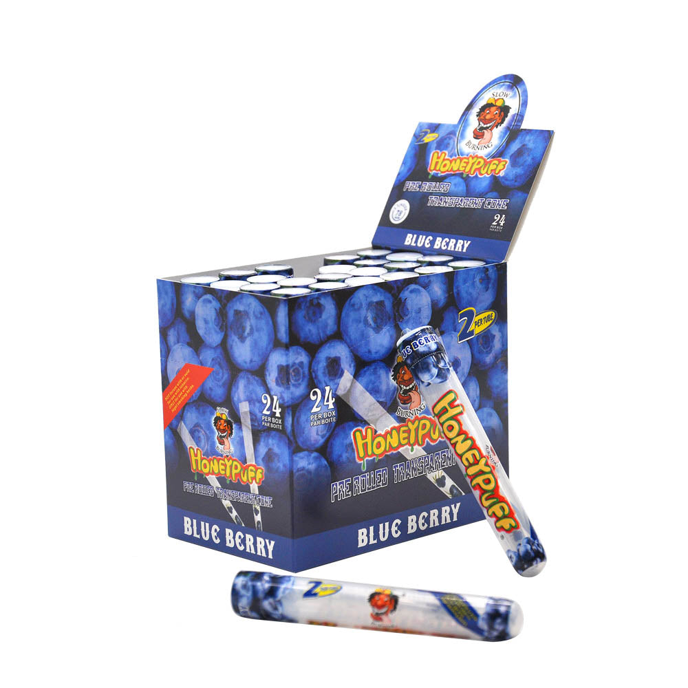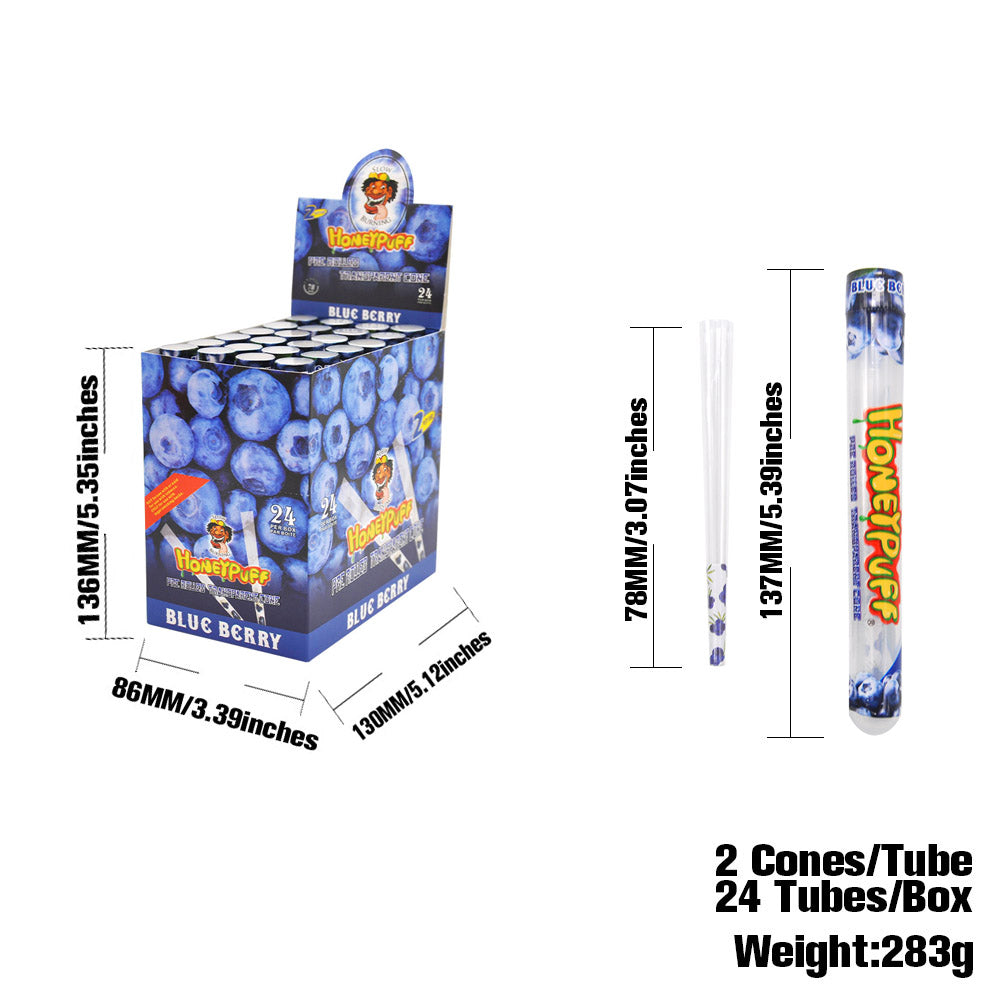 HONEYPUFF 1 1/4 Größe, Blaubeergeschmack, vorgerollte Tüten, transparente Zigarettenpapiere, 2 Stück/Tube, 24 Tuben/Box