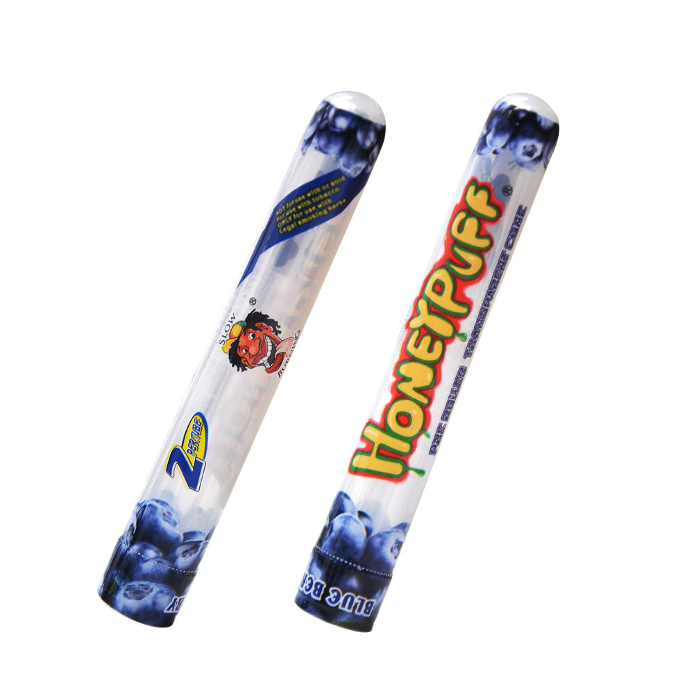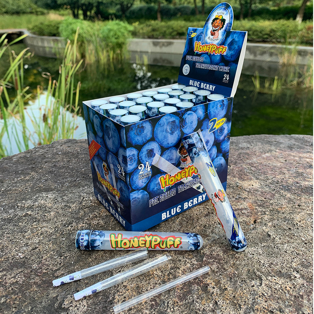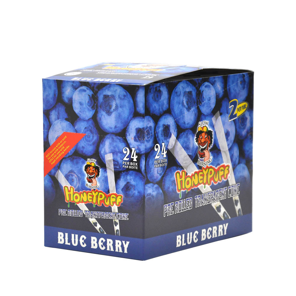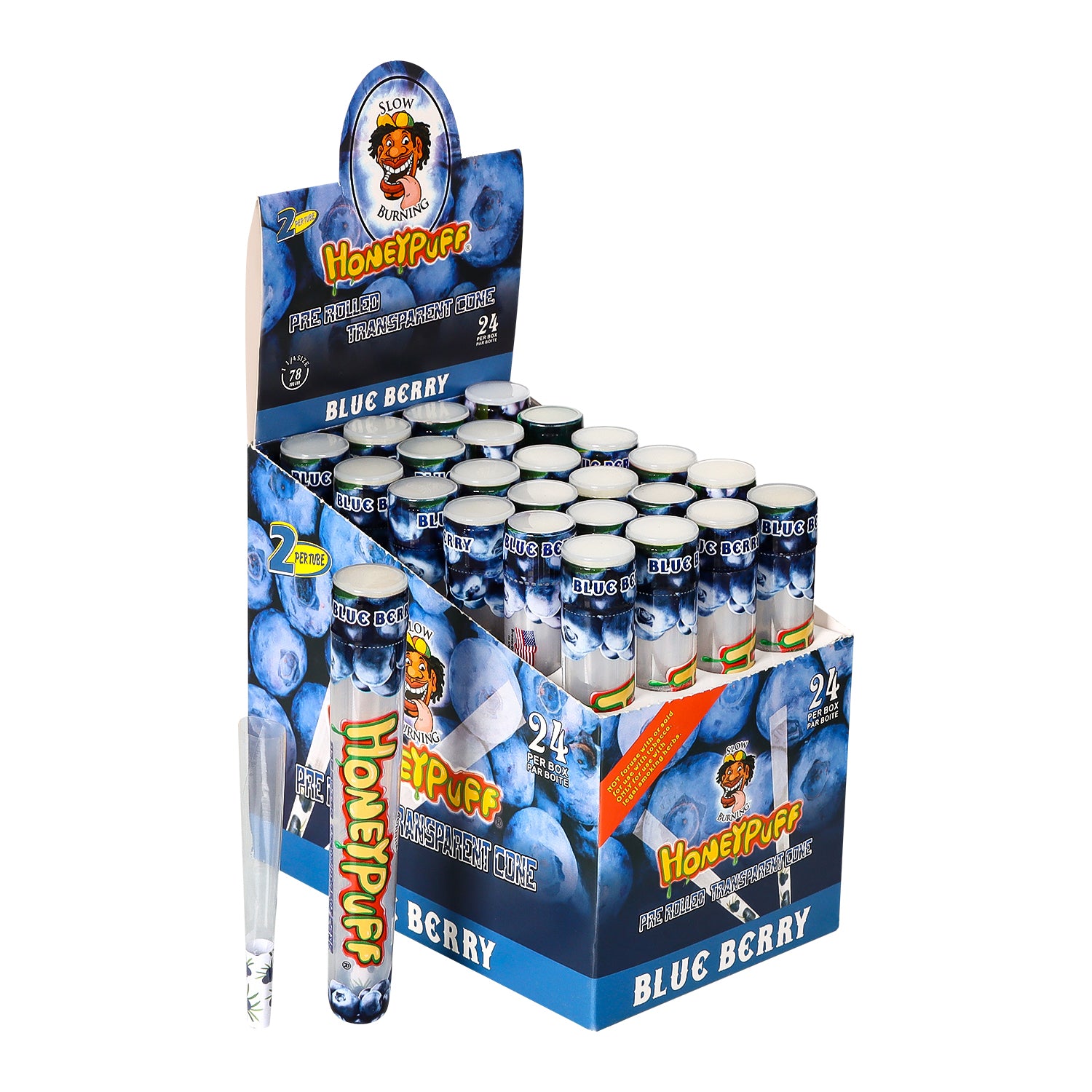 HONEYPUFF 1 1/4 Größe, Blaubeergeschmack, vorgerollte Tüten, transparente Zigarettenpapiere, 2 Stück/Tube, 24 Tuben/Box