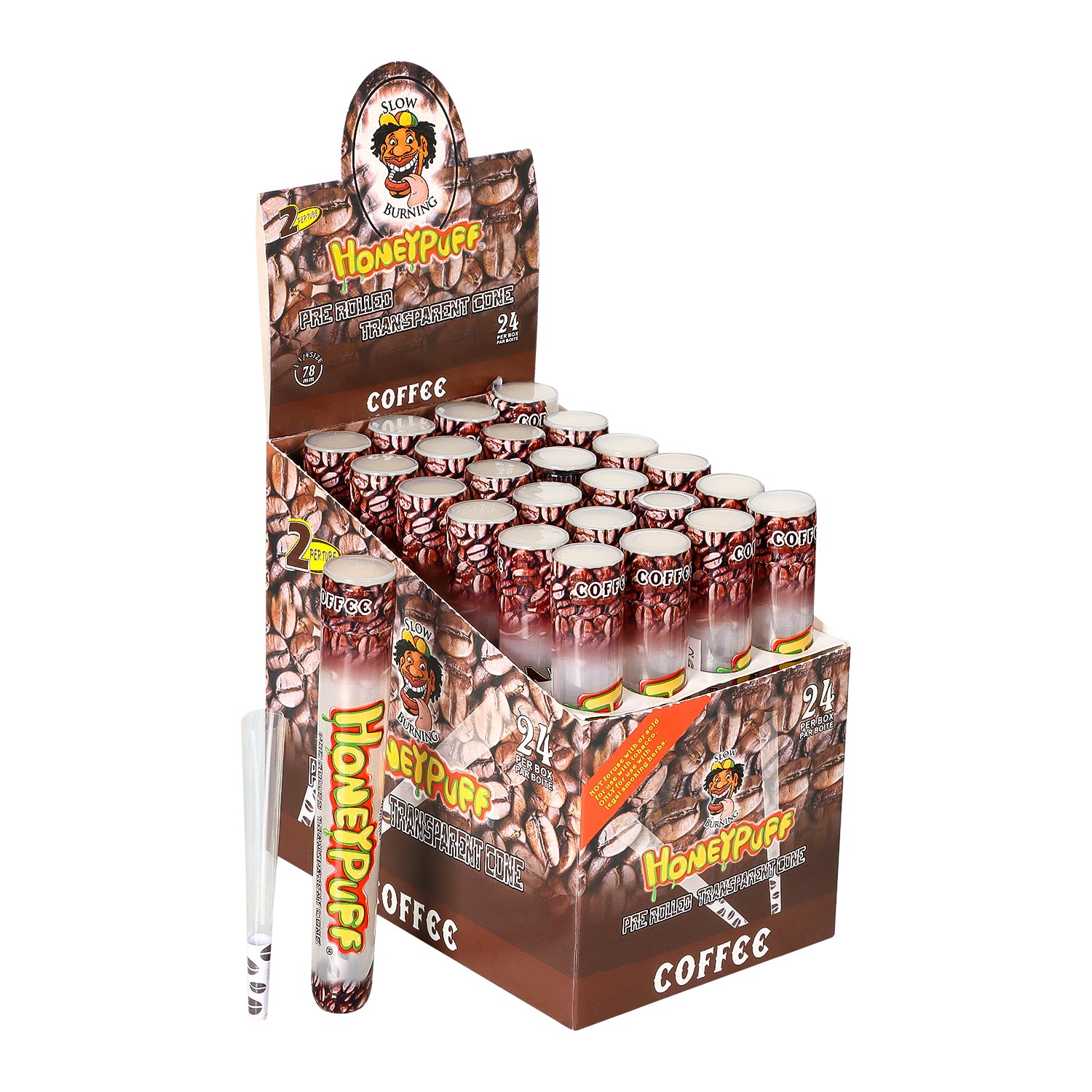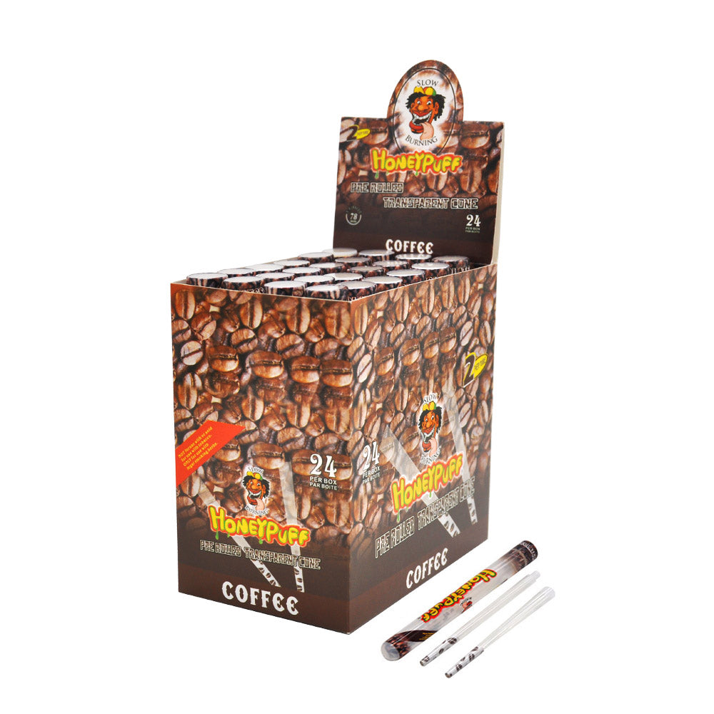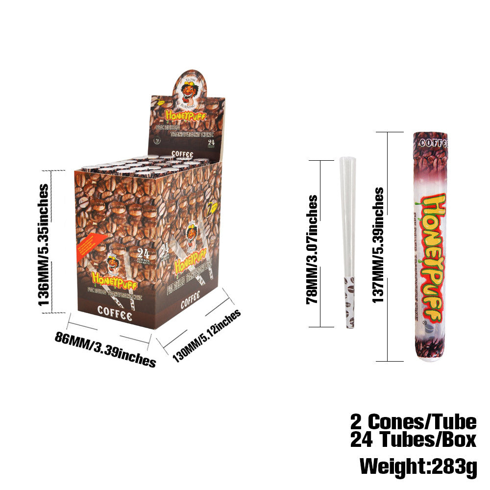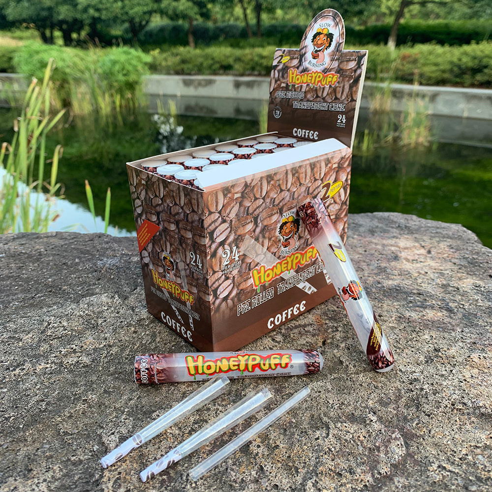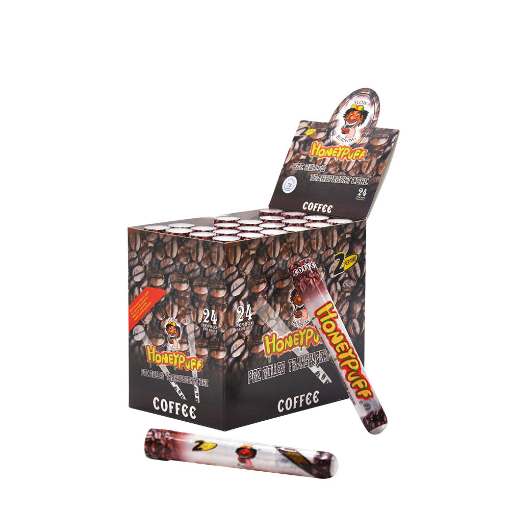HONEYPUFF 1 1/4 Größe Kaffeegeschmack Vorgerollte Tüten, durchsichtige Zigarettenpapiere, 2 Stück/Tube, 24 Tuben/Box