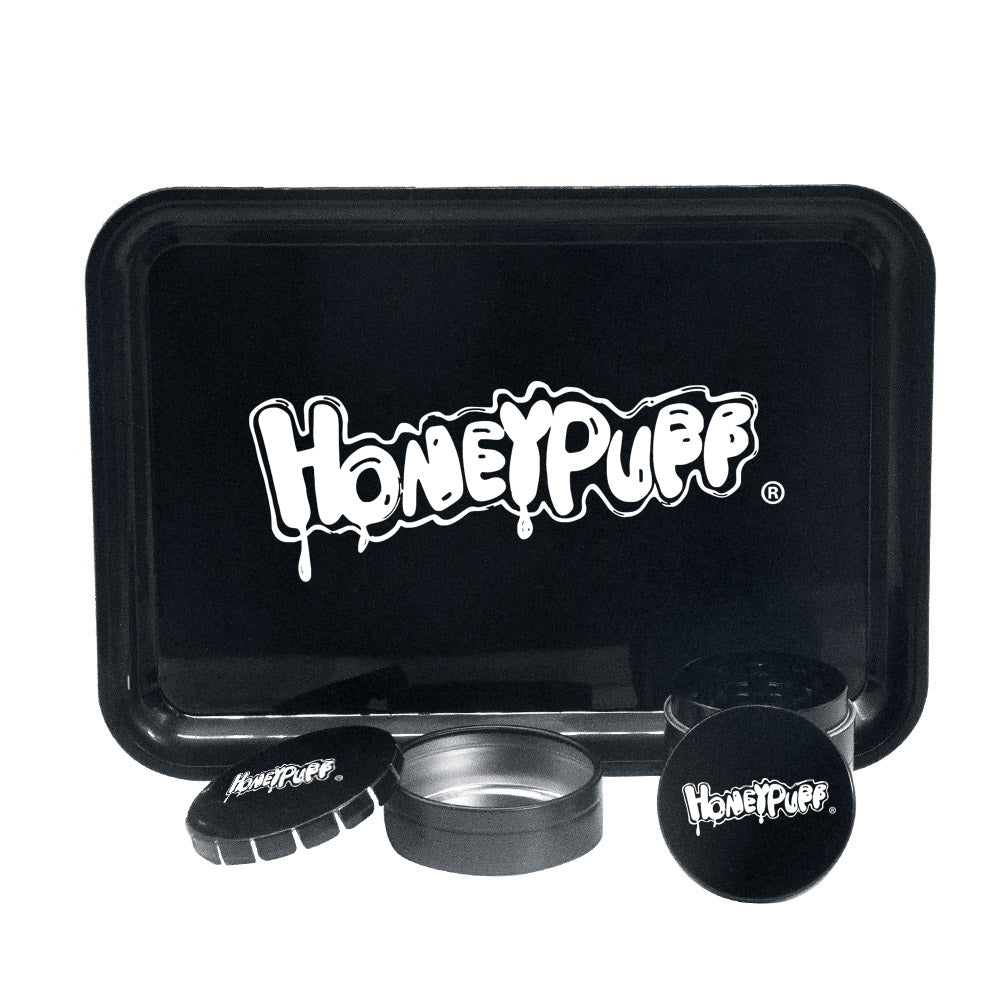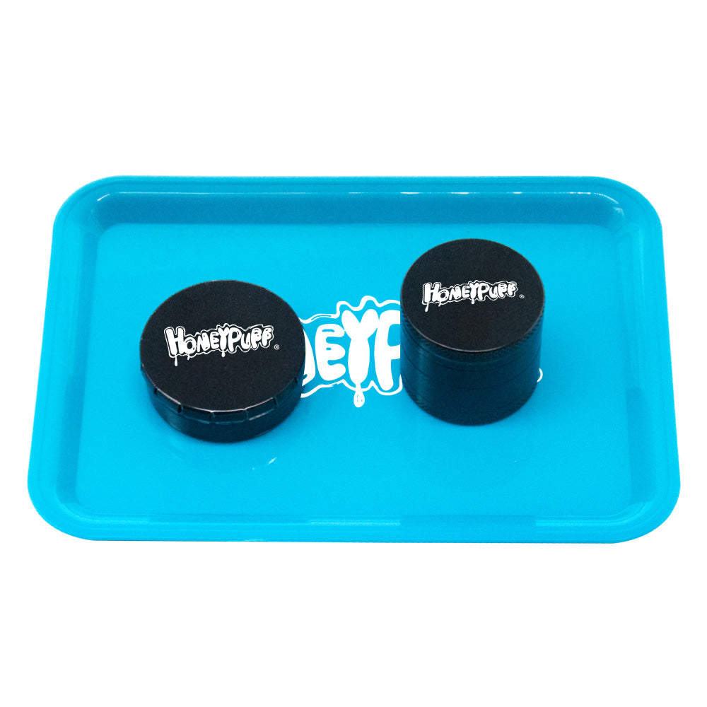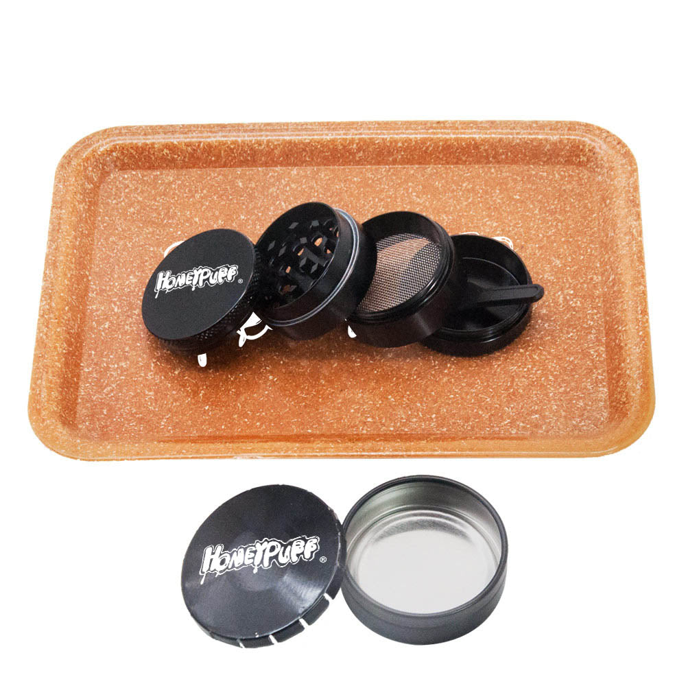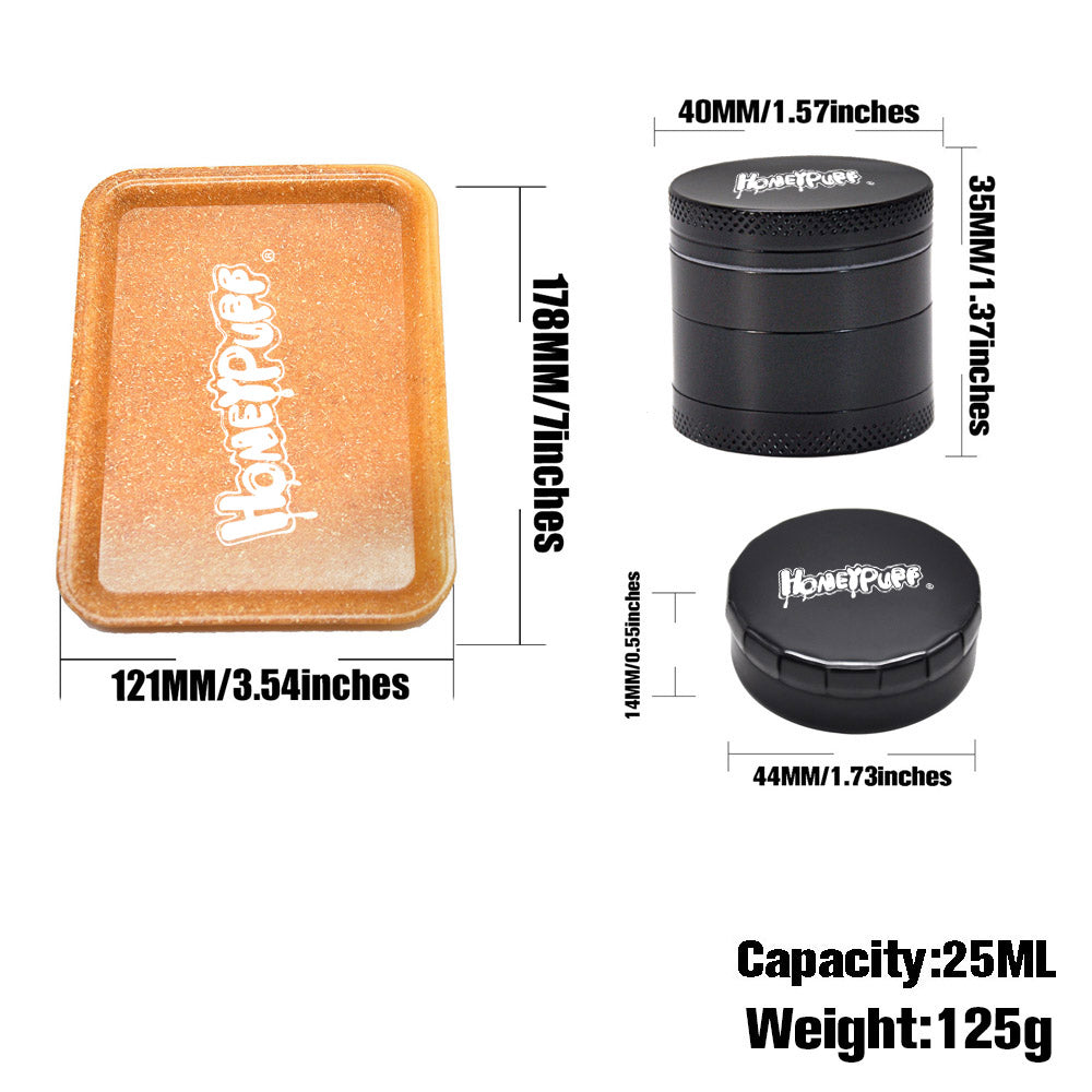 HONEYPUFF Zigarettentablett-Set, 3-teiliges Zigarettenzubehör-Set, Kunststoffplatte, Blechdose, Rauchmühle aus Zinklegierung