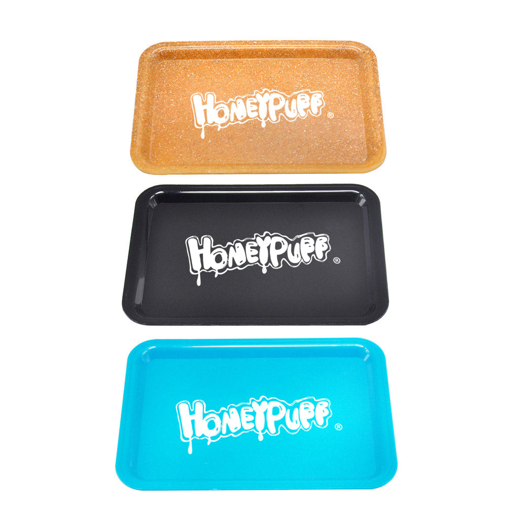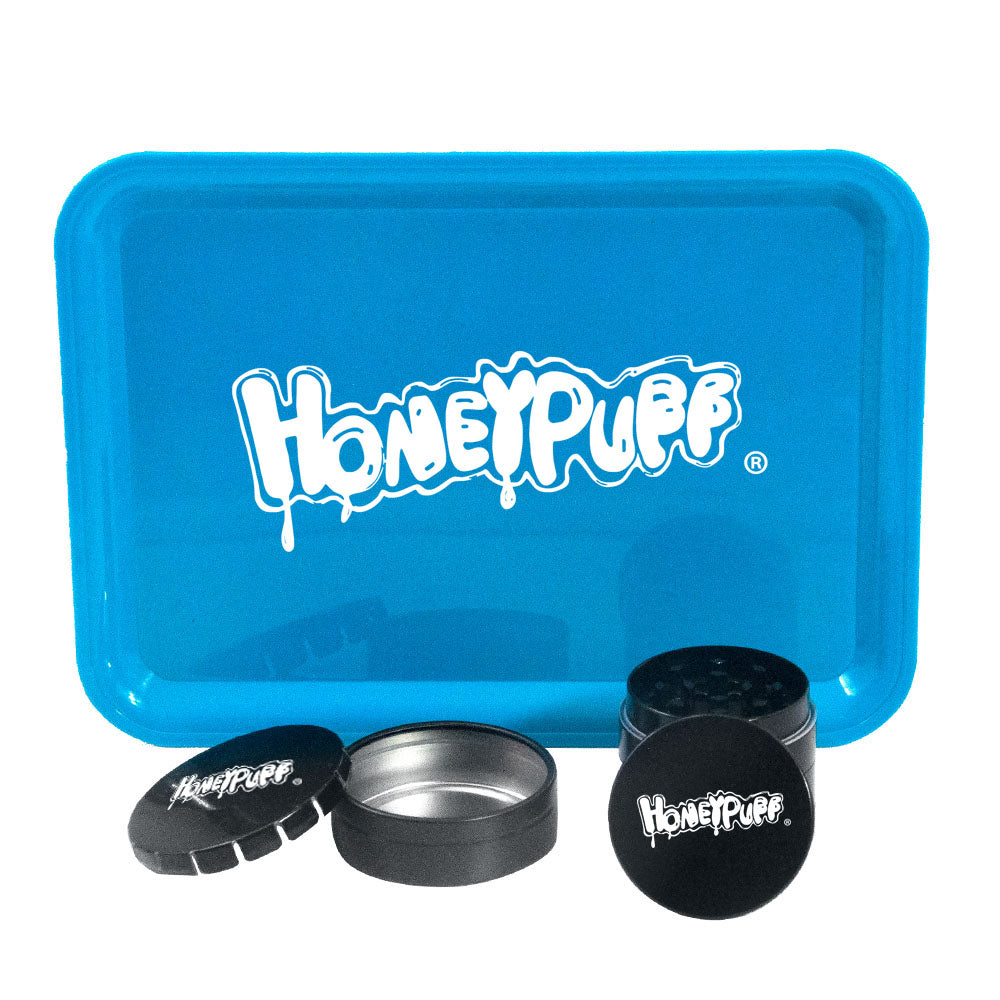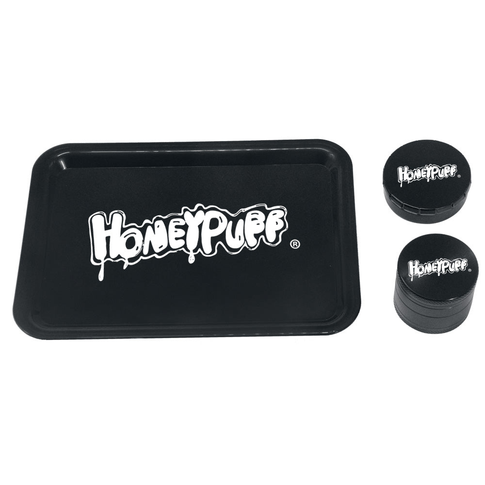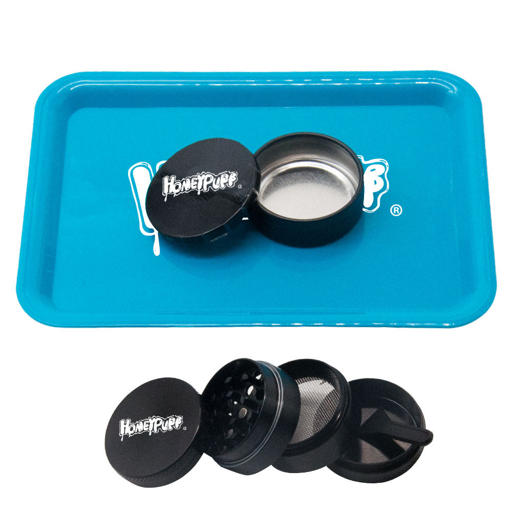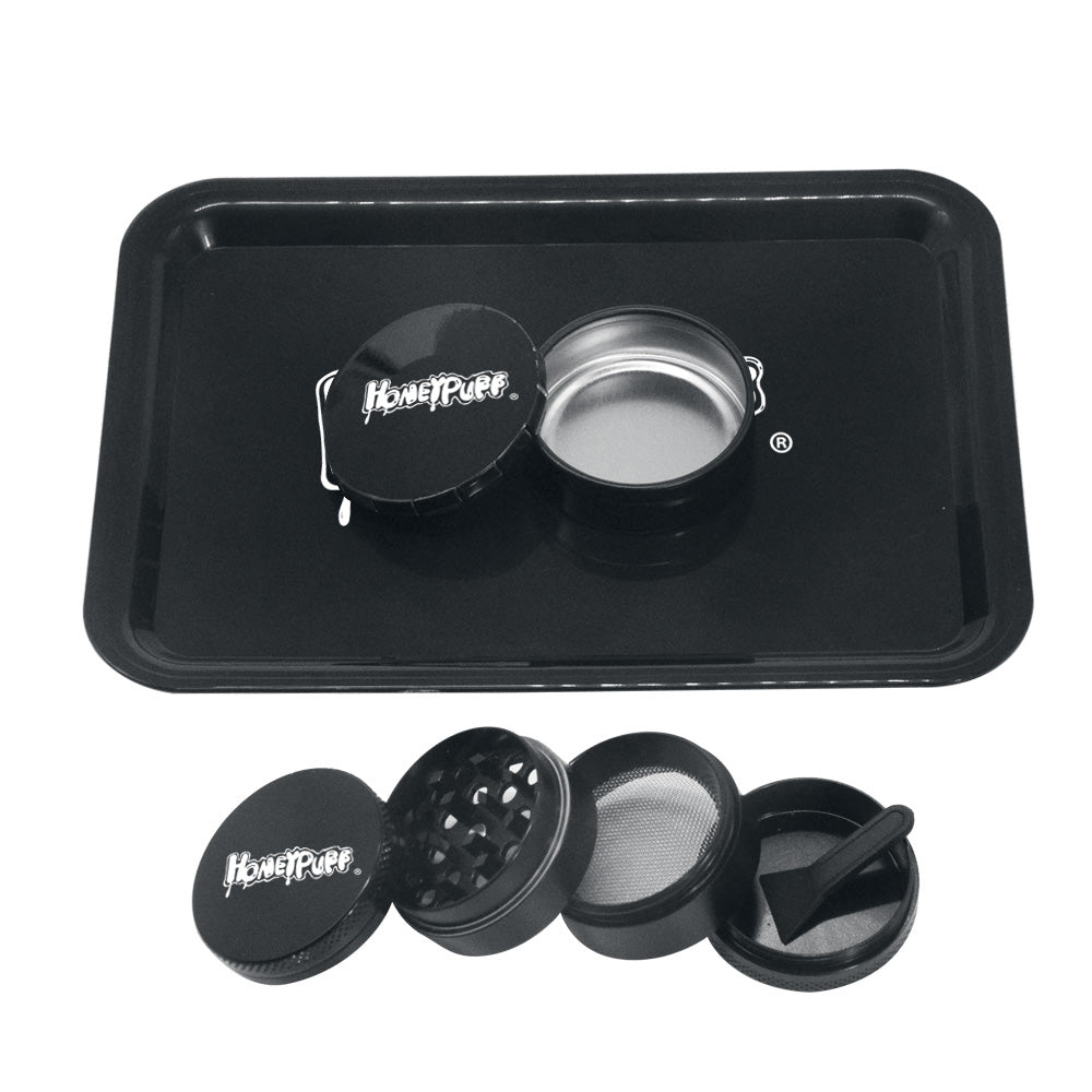 HONEYPUFF Zigarettentablett-Set, 3-teiliges Zigarettenzubehör-Set, Kunststoffplatte, Blechdose, Rauchmühle aus Zinklegierung