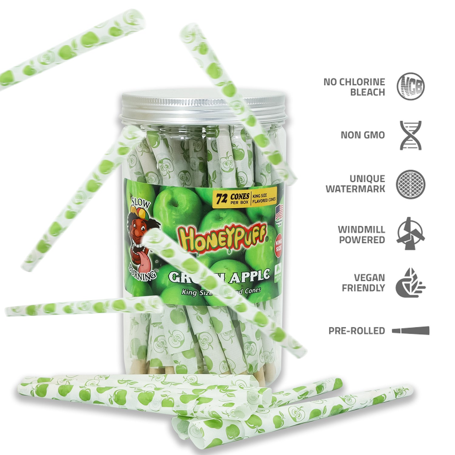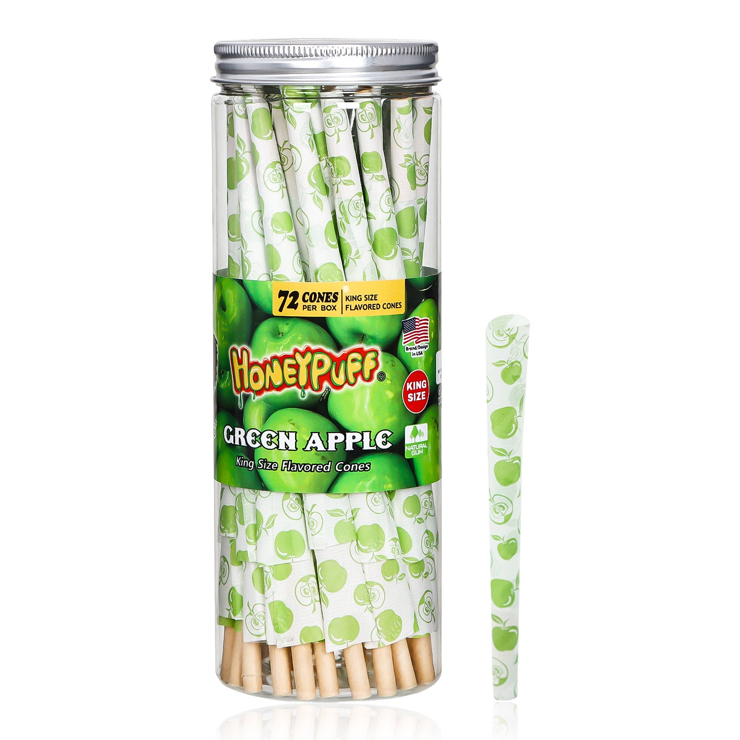 HONEYPUFF Vorgerollte Tüten mit grünem Apfelgeschmack, King Size Rolling Cones mit Tips, 72 Stück vorgerolltes Zigarettenpapier, langsam abbrennendes Zigarettenpapier