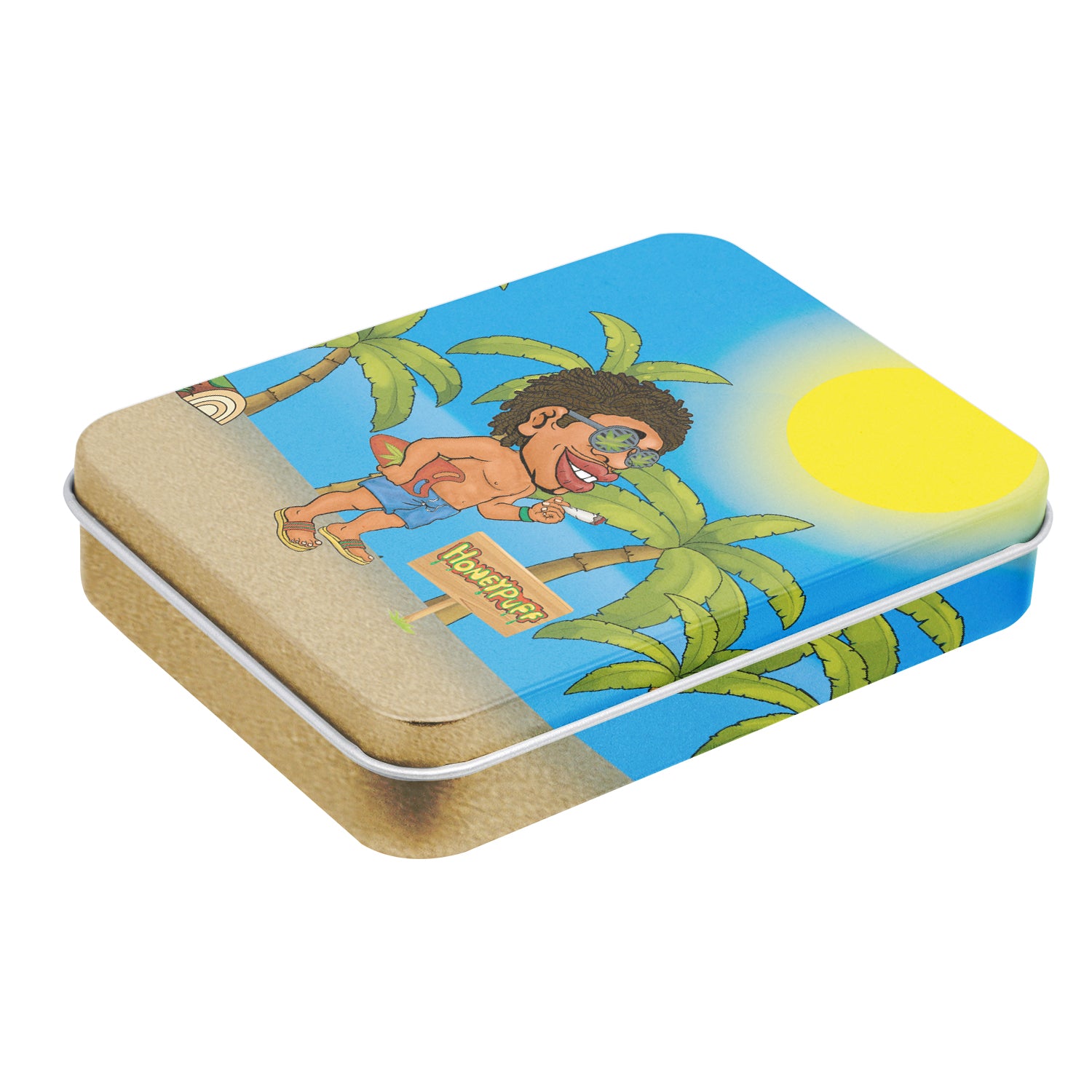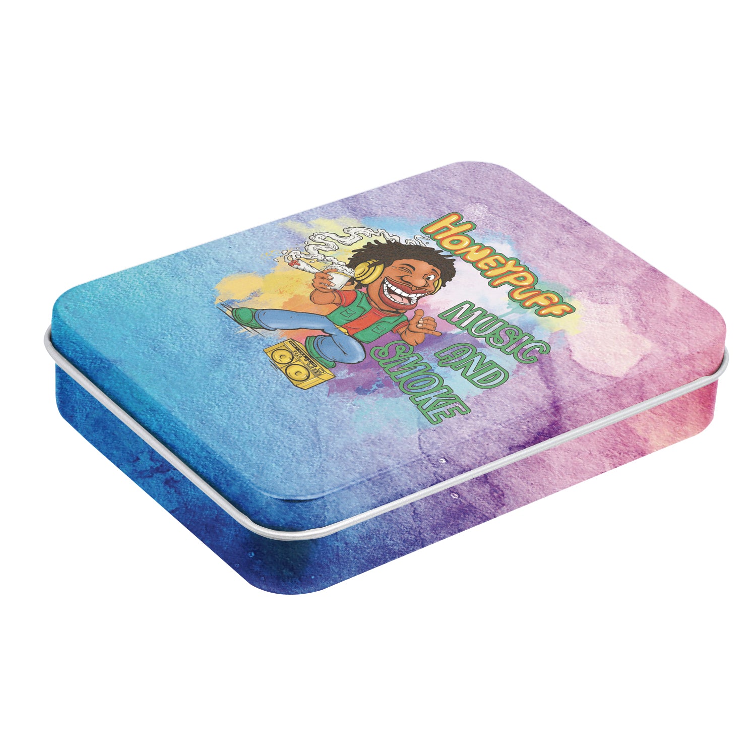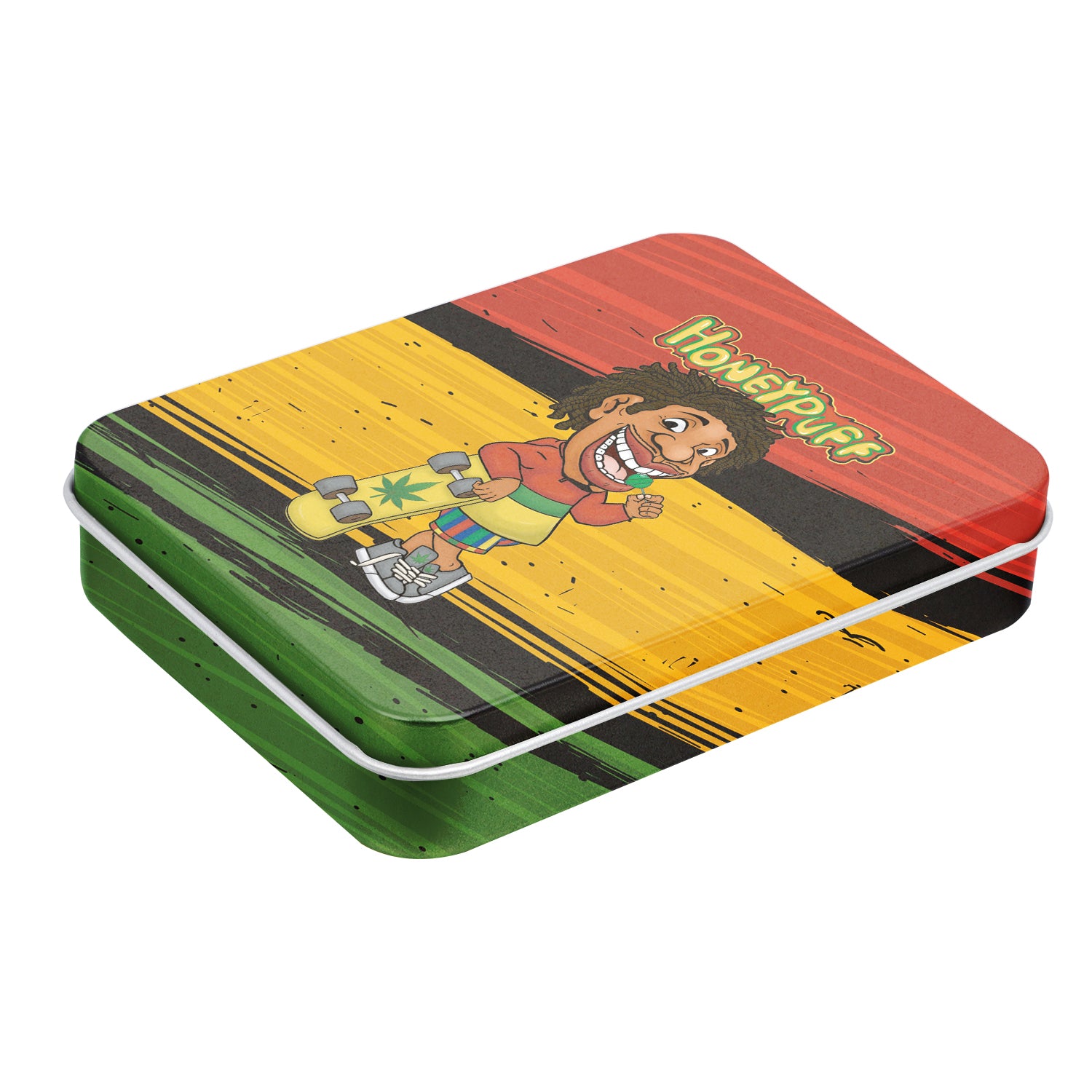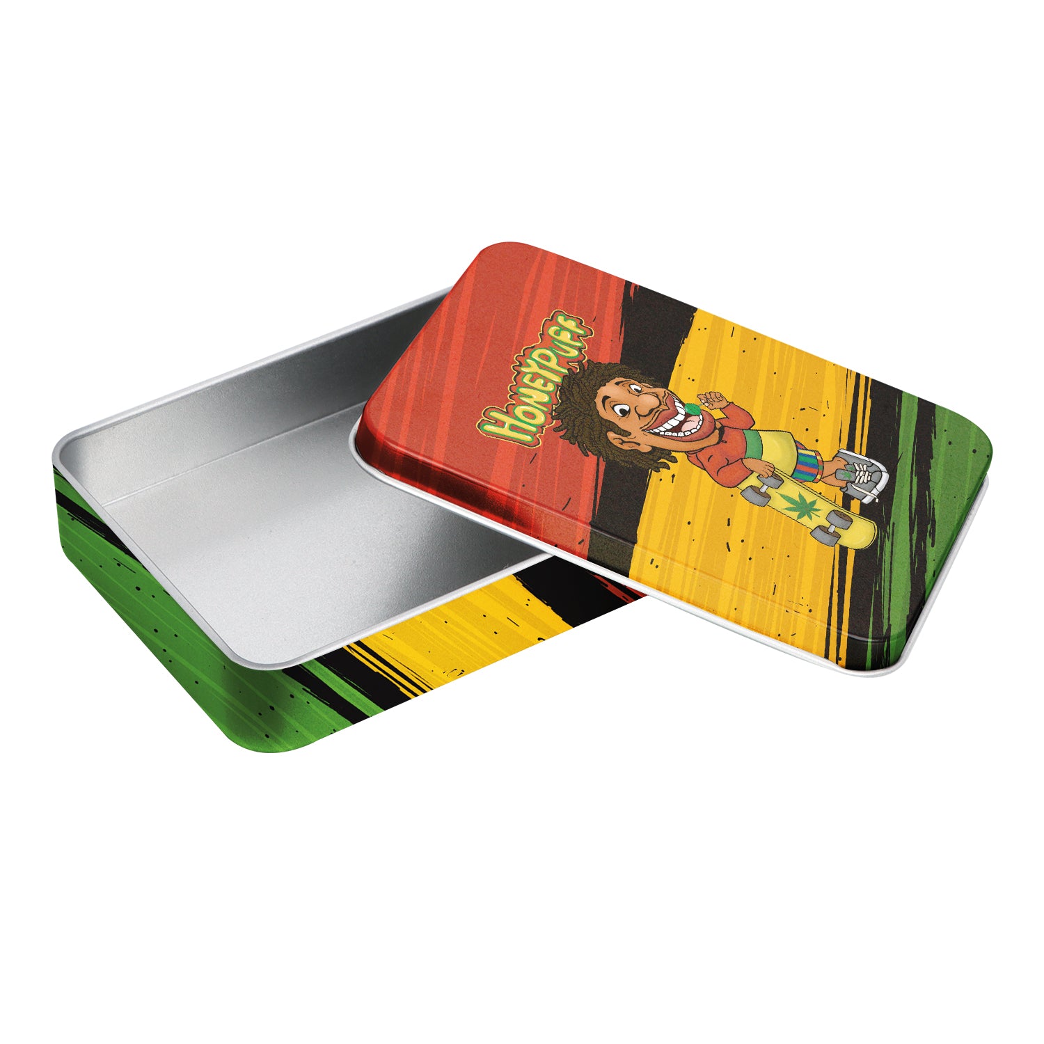 - Außen komplett im Honeypuff-Design bedruckt. Im Deckel ist das Honeypuff-Logo eingeprägt.