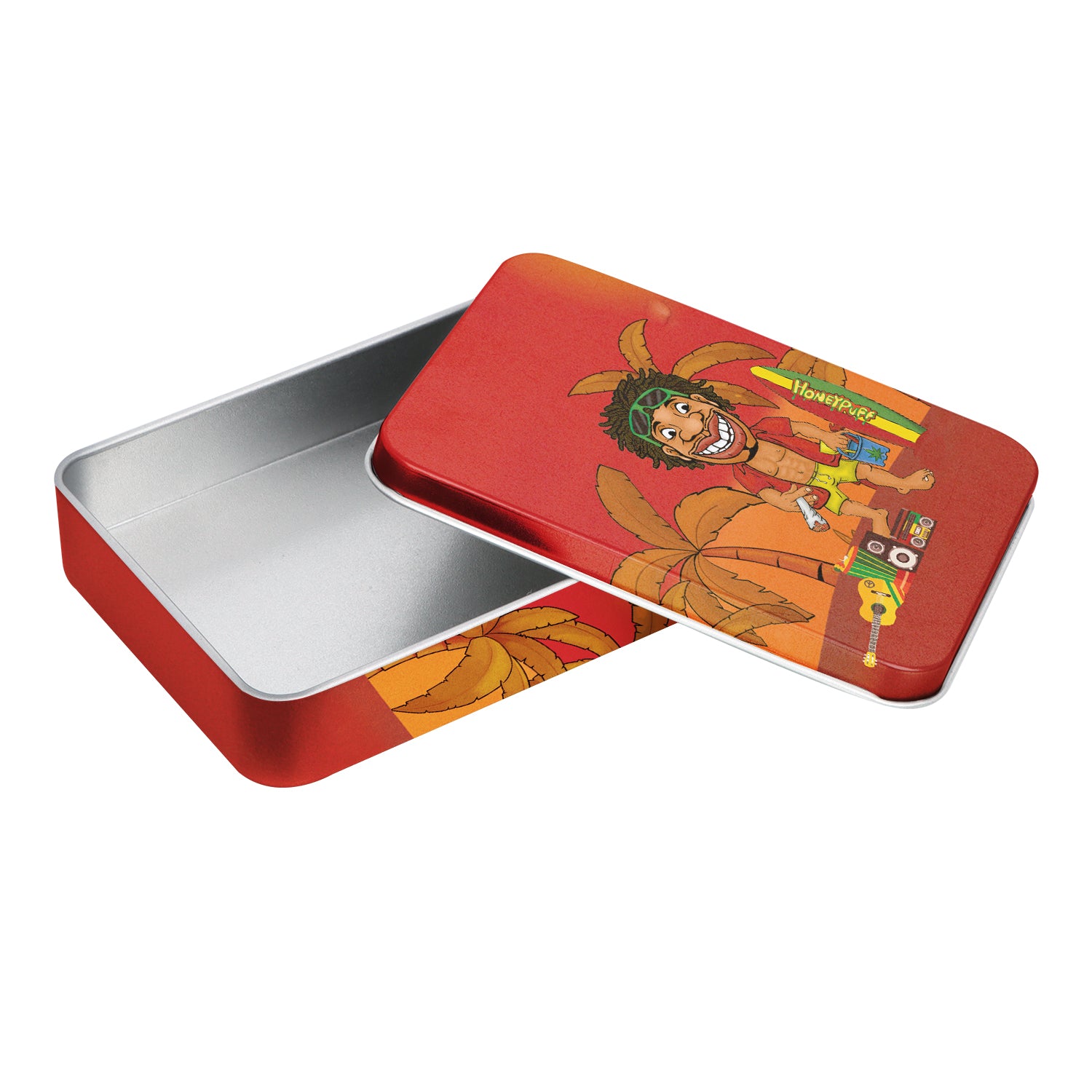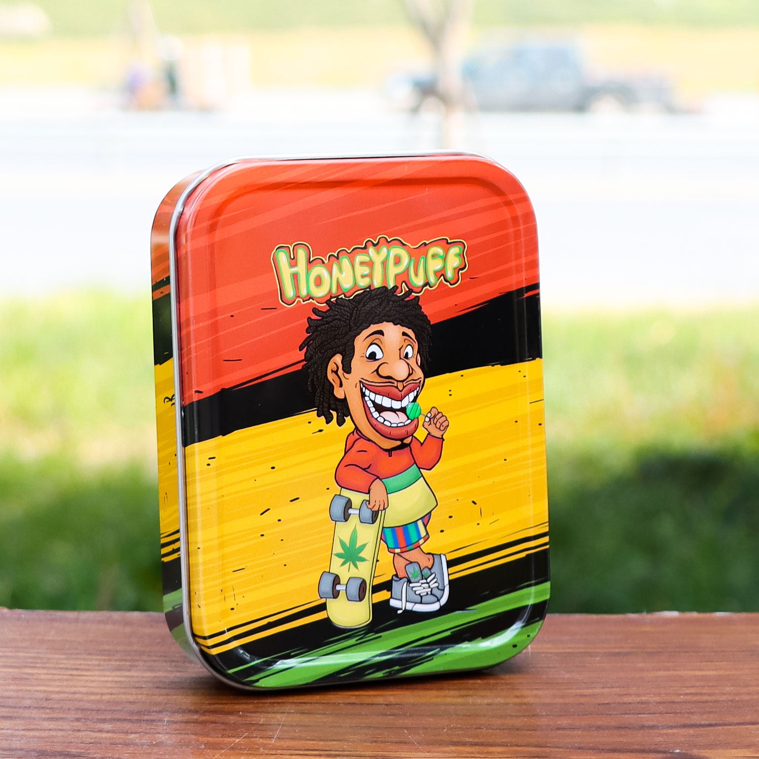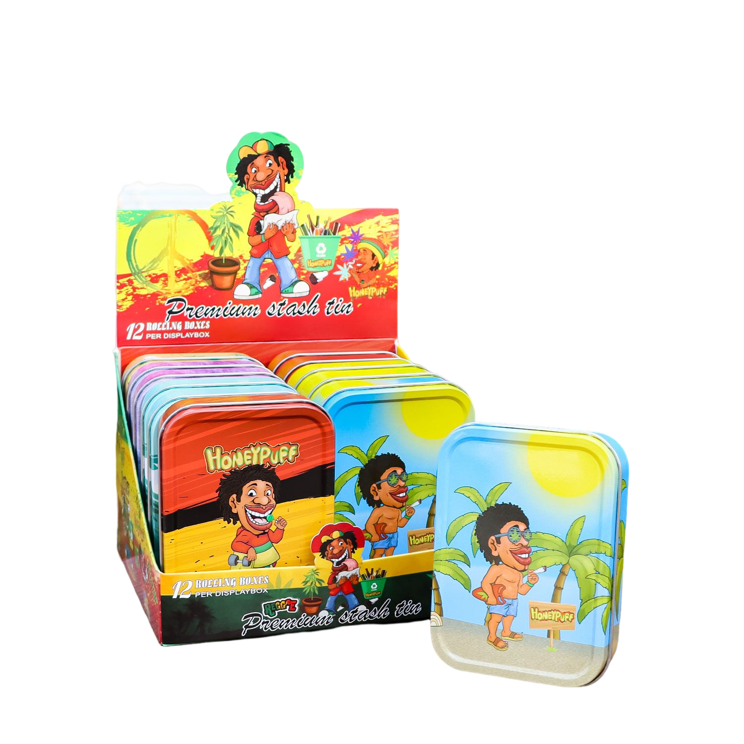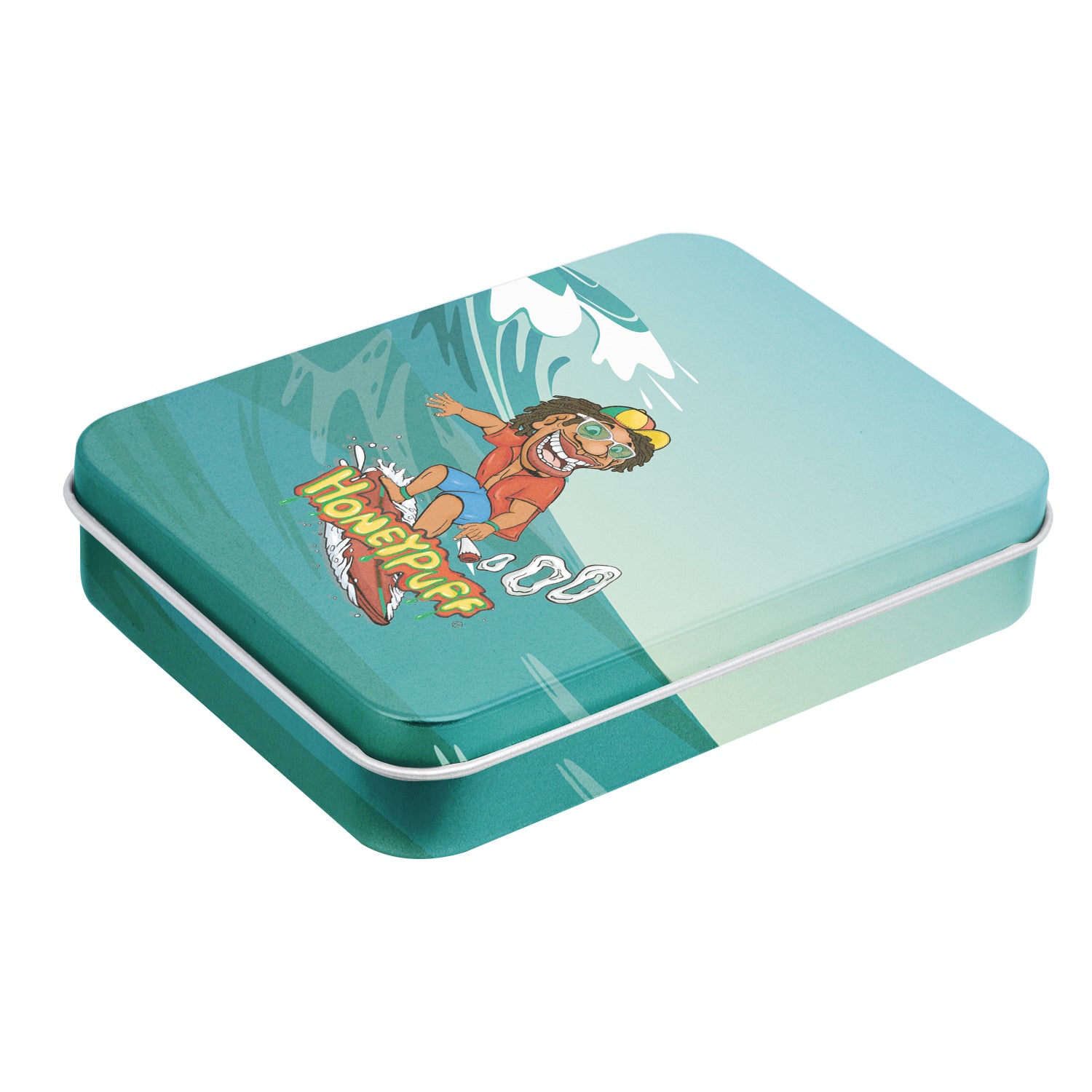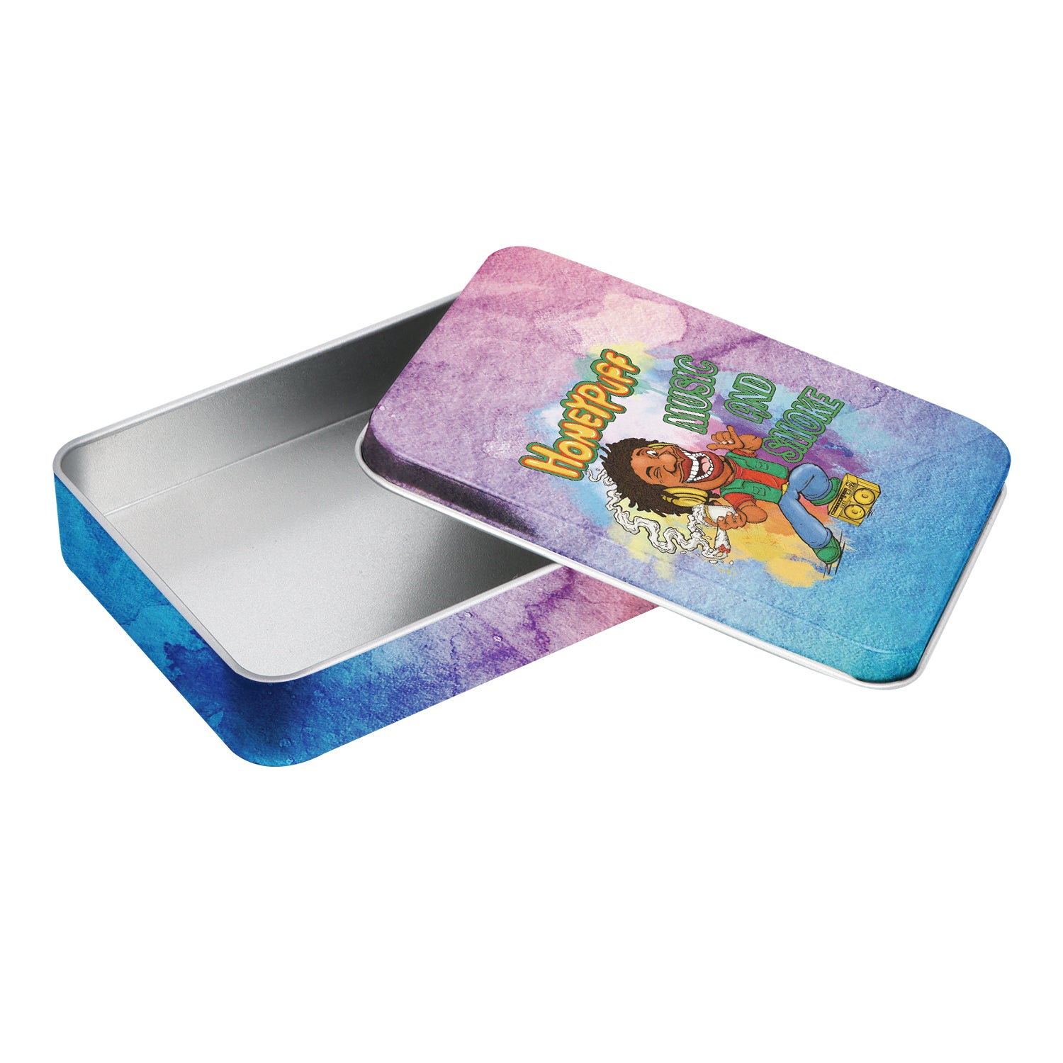 - Außen komplett im Honeypuff-Design bedruckt. Im Deckel ist das Honeypuff-Logo eingeprägt.