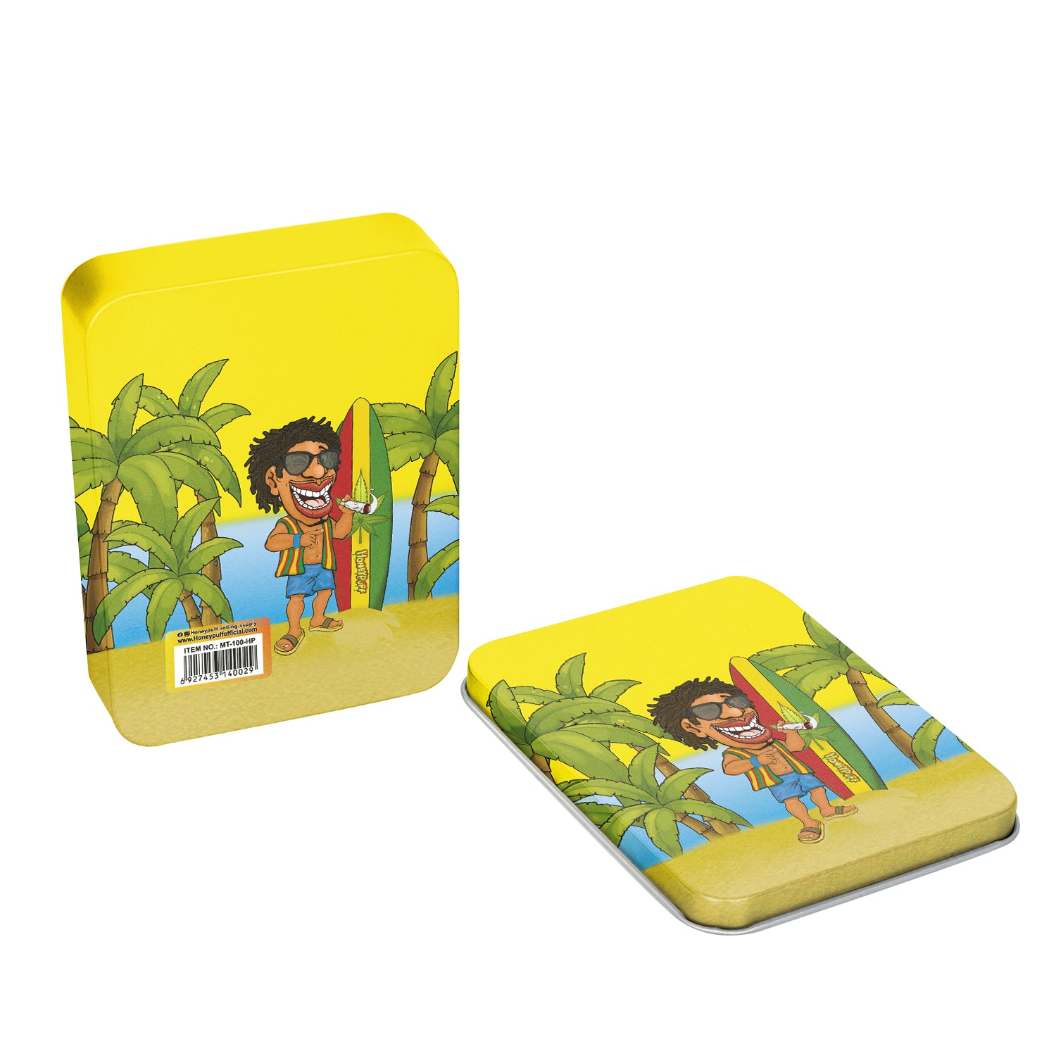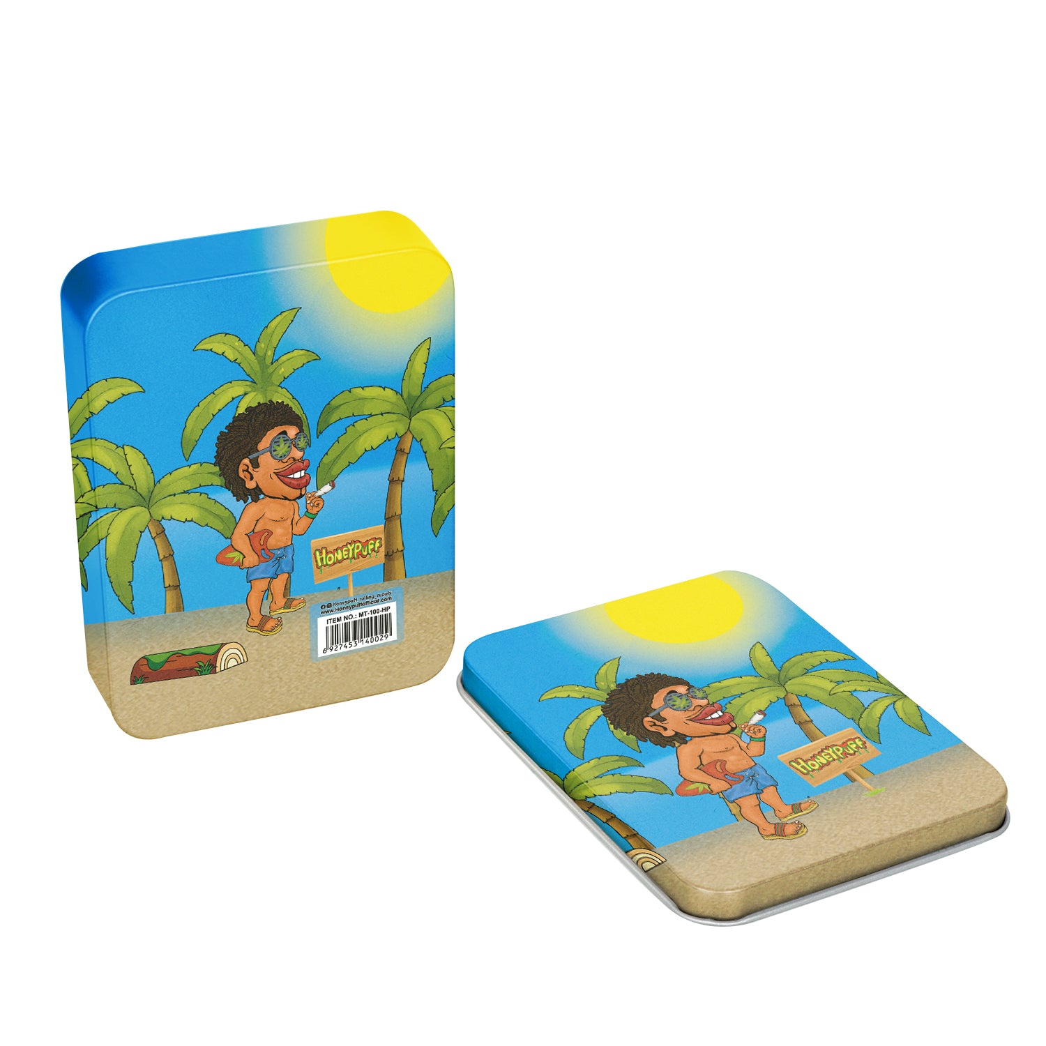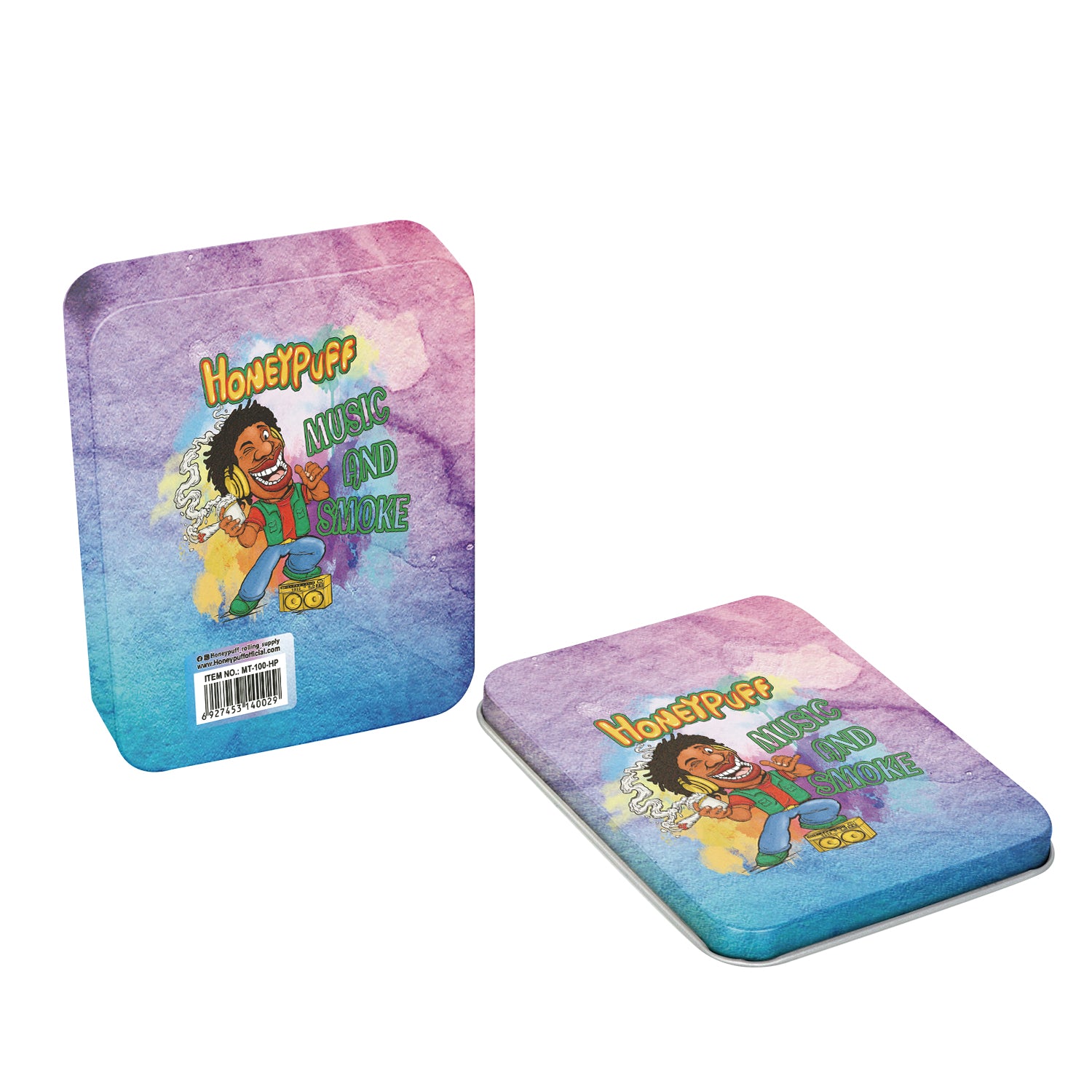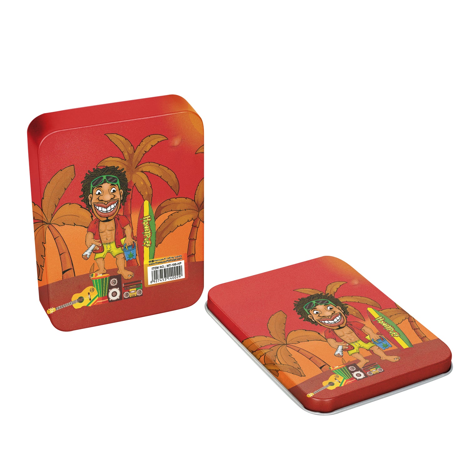 - Außen komplett im Honeypuff-Design bedruckt. Im Deckel ist das Honeypuff-Logo eingeprägt.