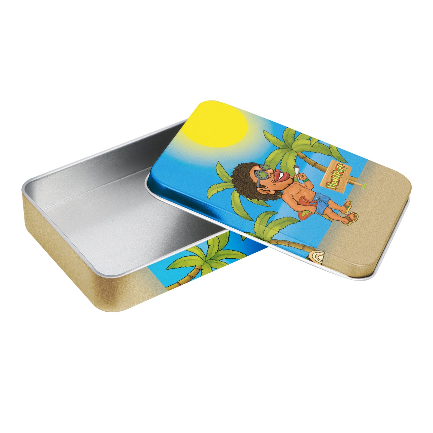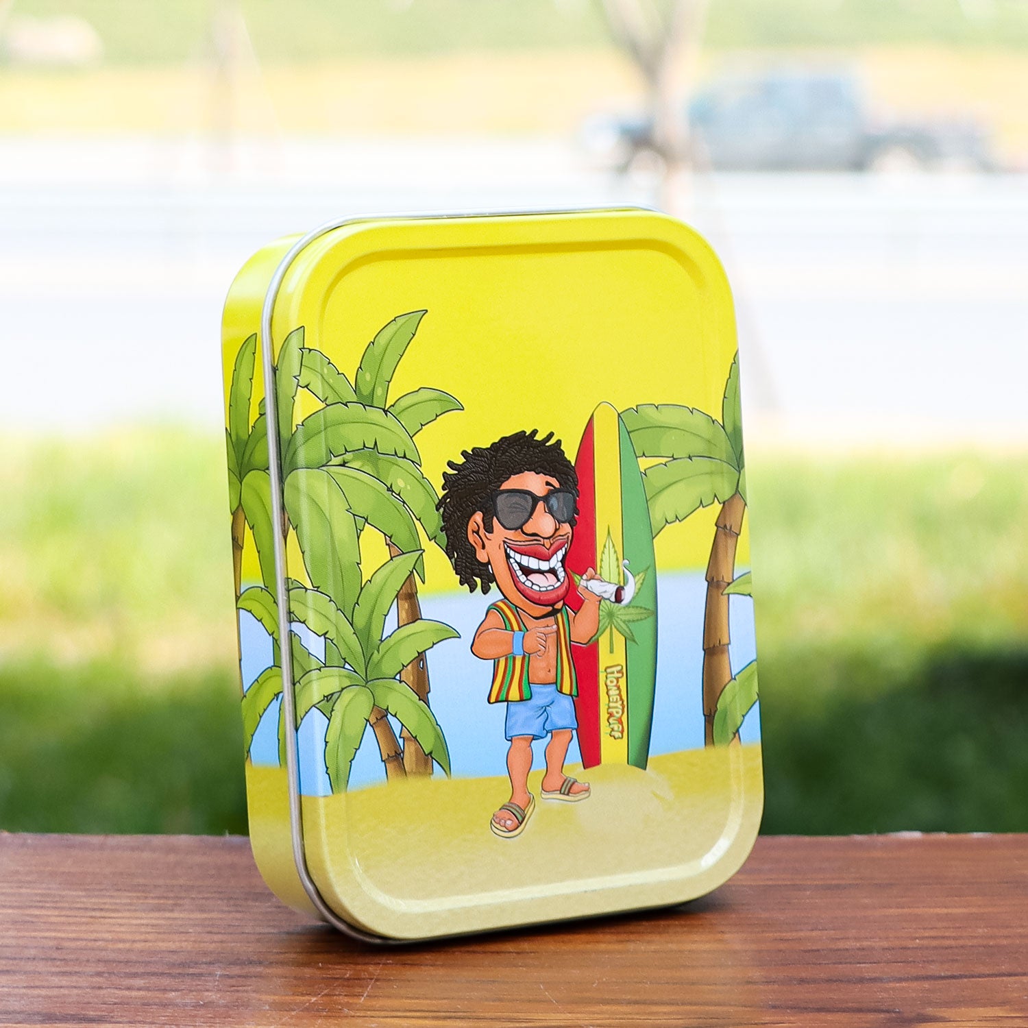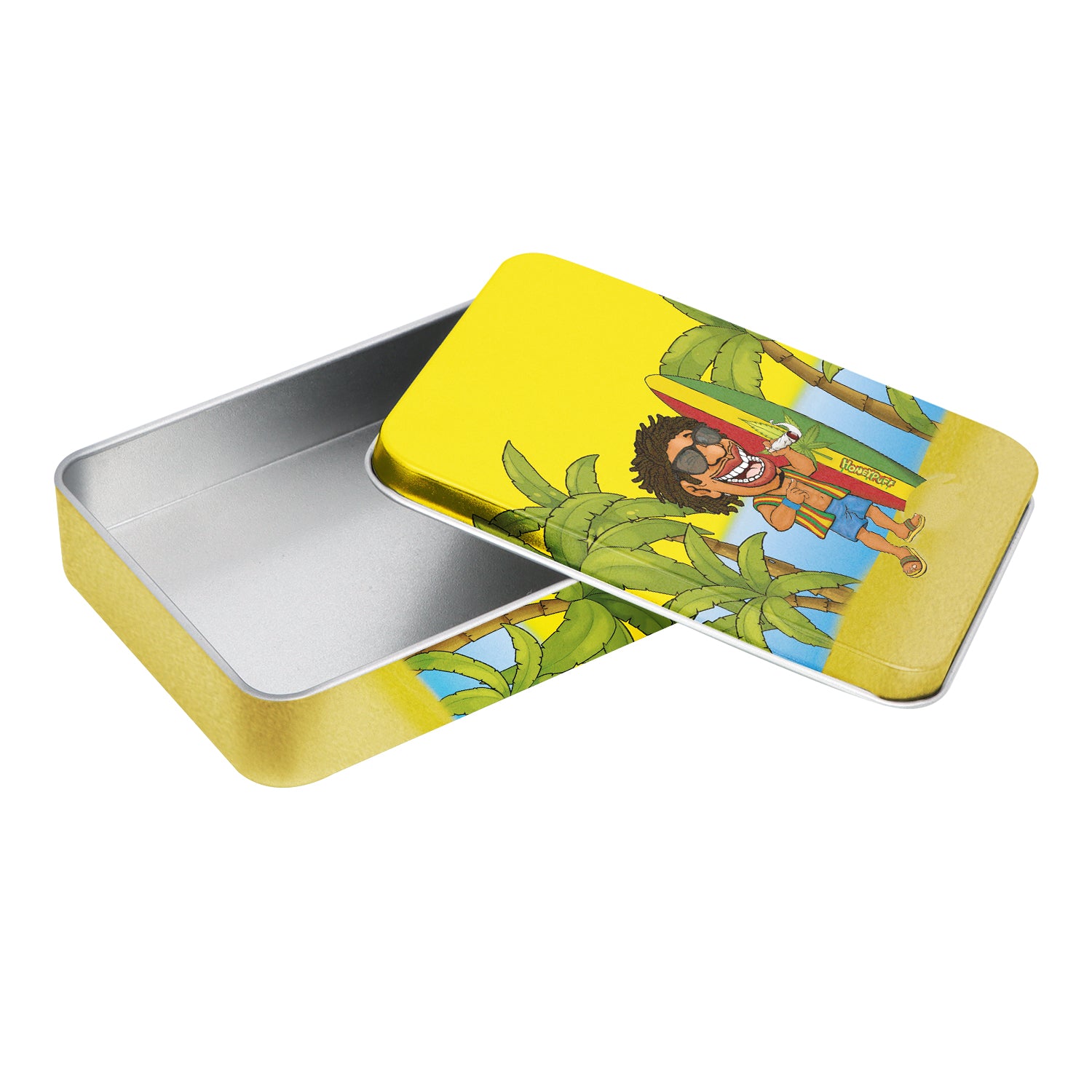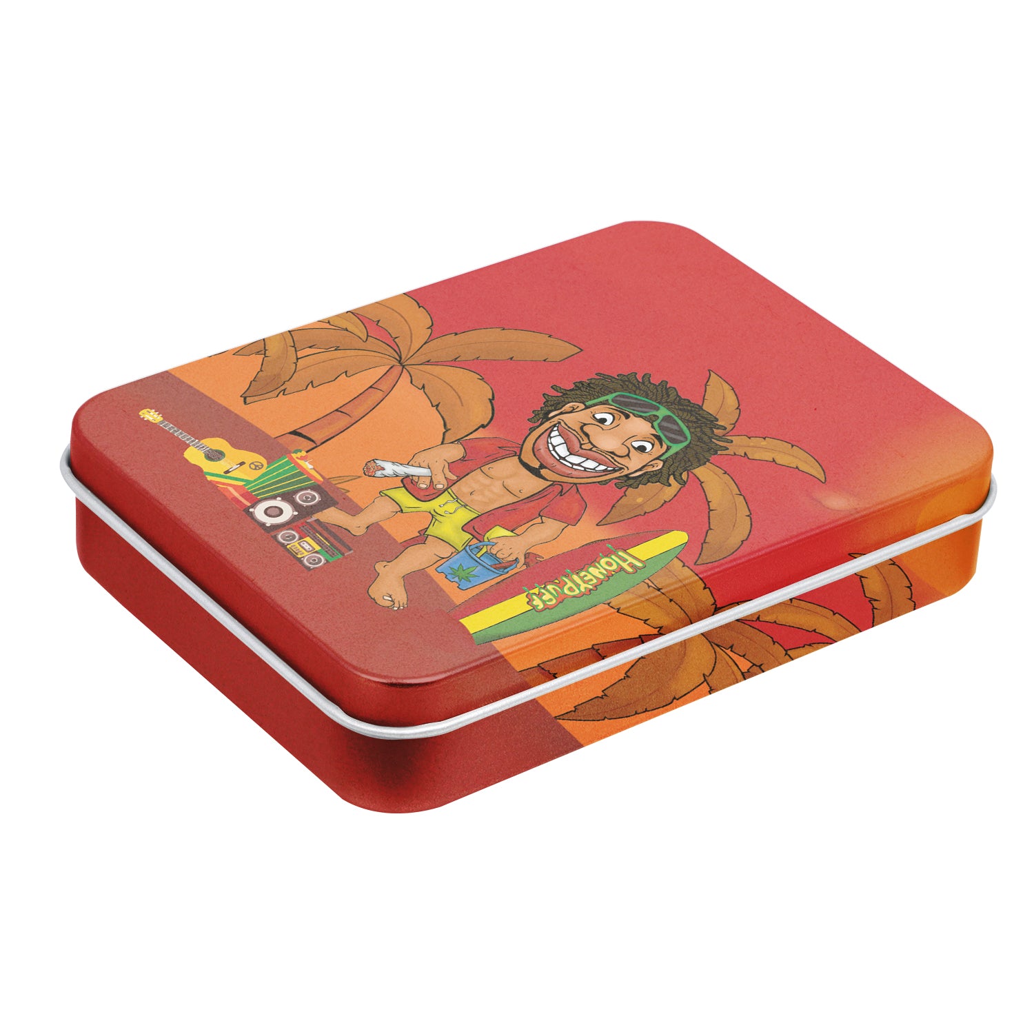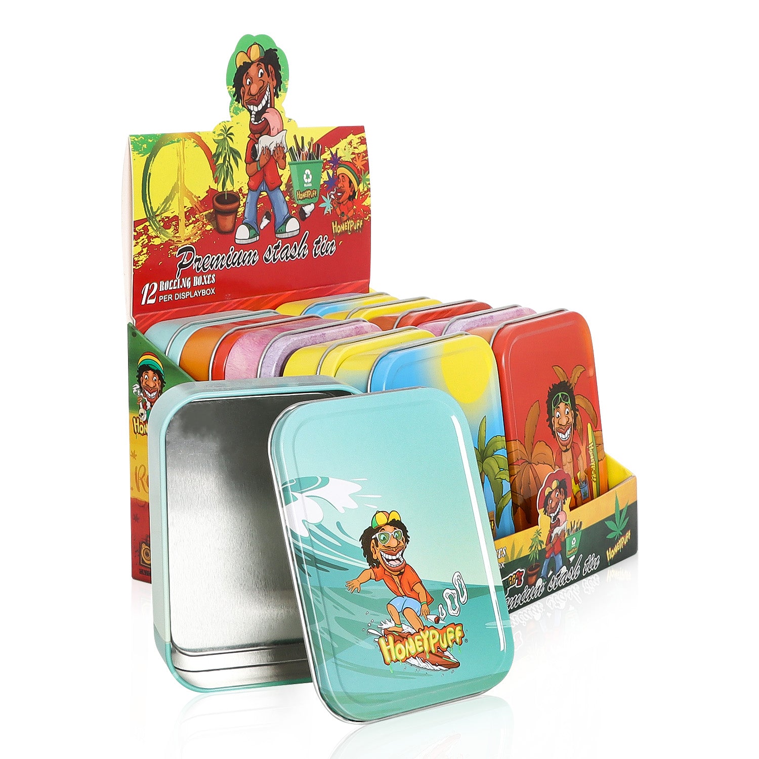 - Außen komplett im Honeypuff-Design bedruckt. Im Deckel ist das Honeypuff-Logo eingeprägt.