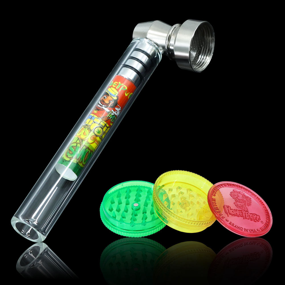 HONEYPUFF Kräutermühlen-Set, Glas-Handpfeife mit Metallschale, Kräutermühle aus Kunststoff, 5-teiliges Edelstahl-Pfeifensieb