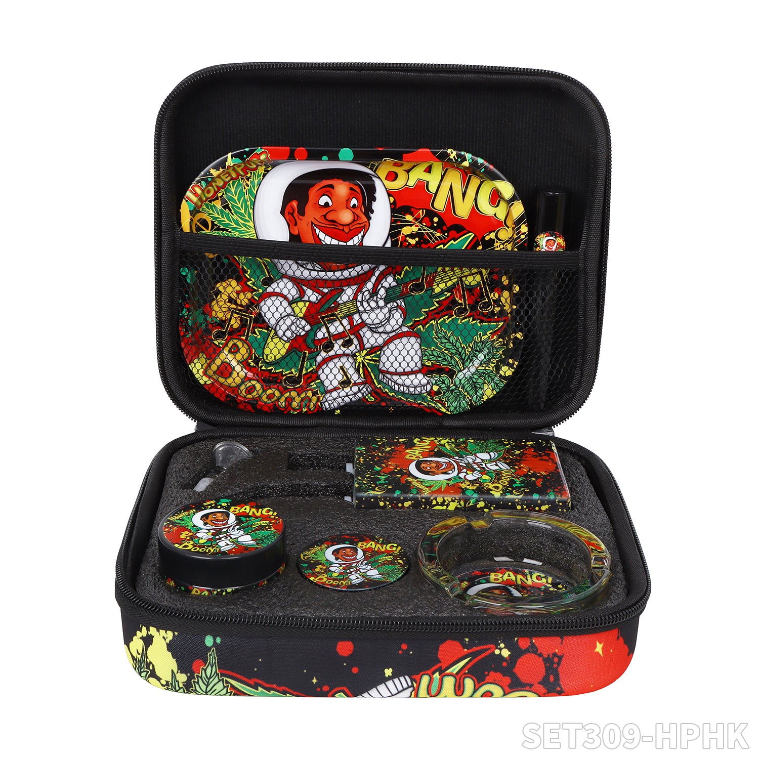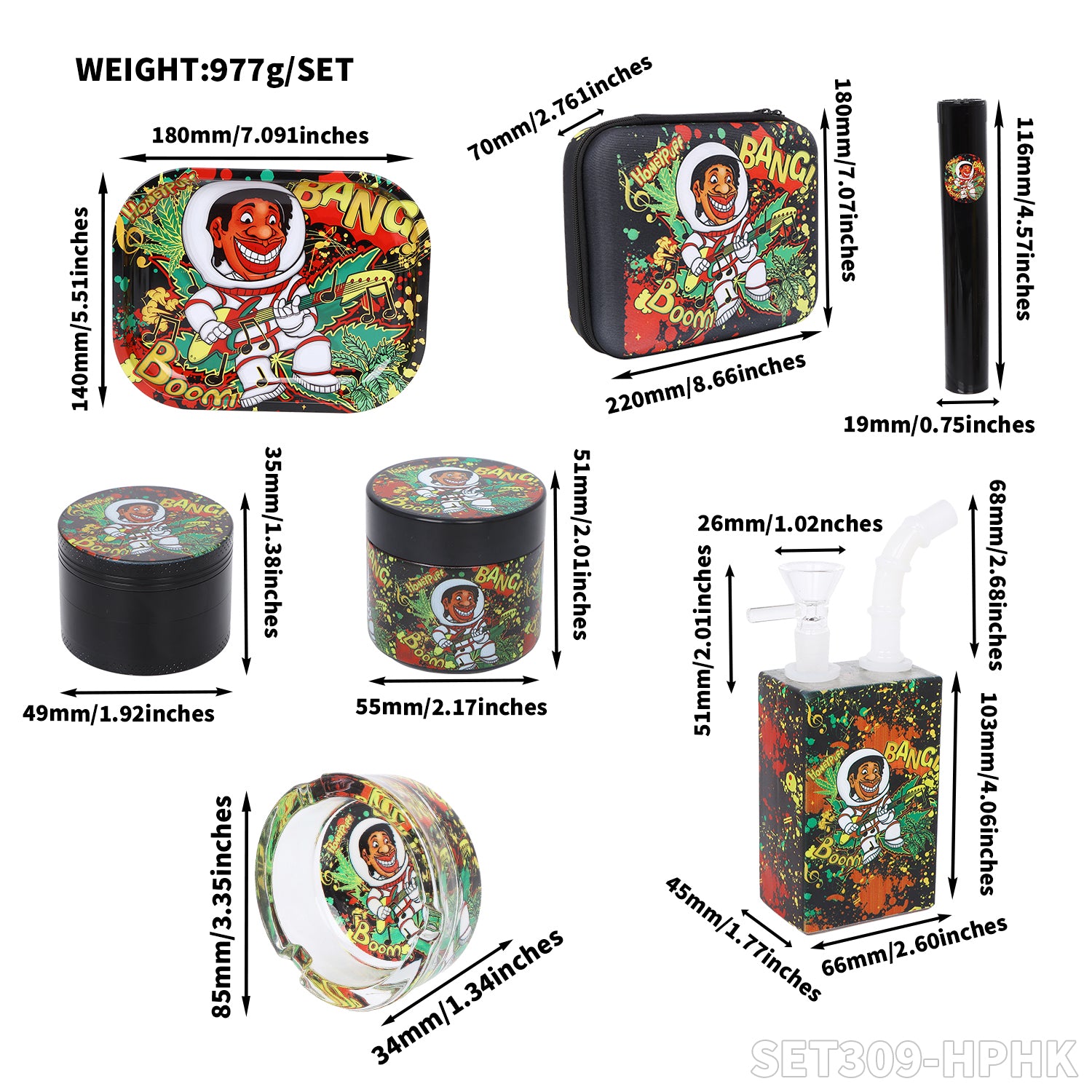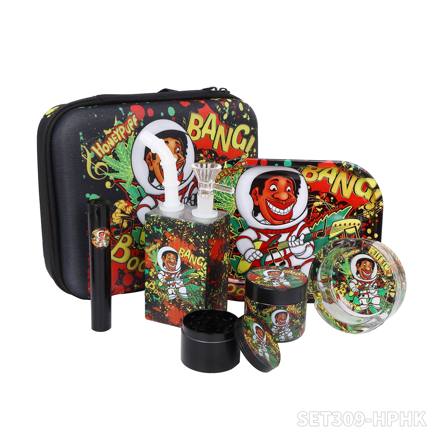 Honeypuff smoking kit with tin rolling tray +lglass storage jar+zinc alloy grinder+joint holder+glass water bong+glass ashtray