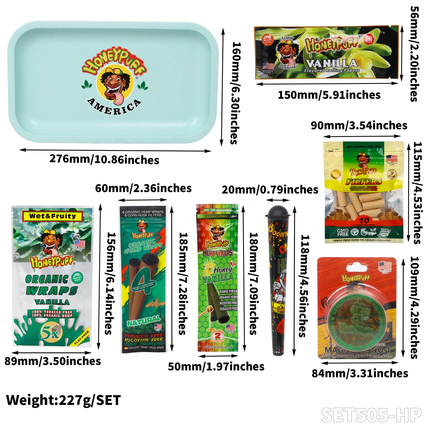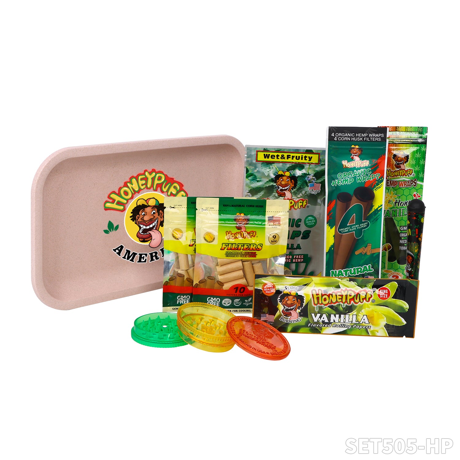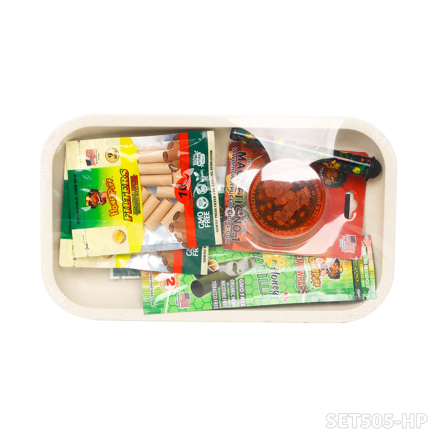 Honeypuff smoking kit with biodegradable rolling tray+3 bags hemp wrap+1 pack rolling paper+1 pcs joint holder+1 pcs plasitc grinder+2 bags filter tips