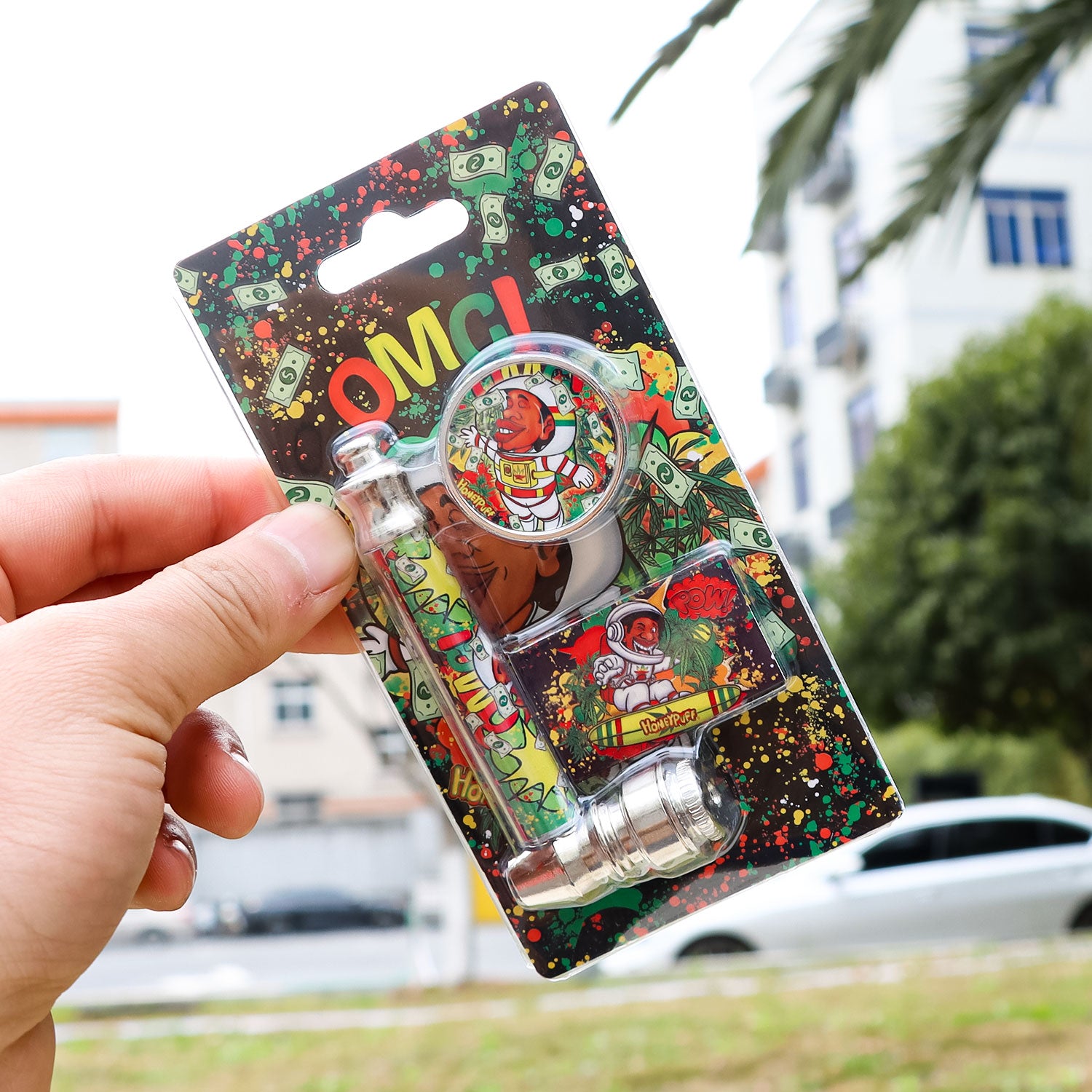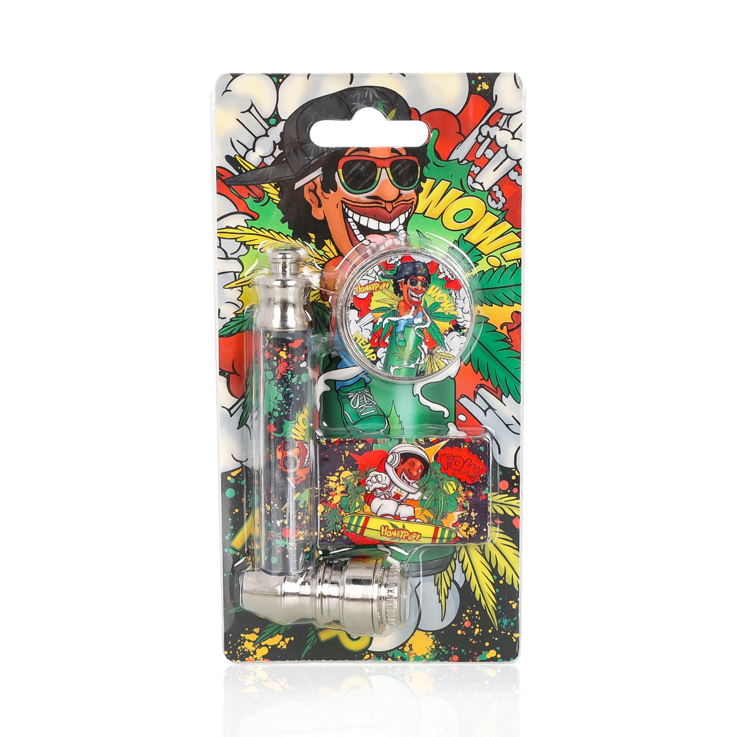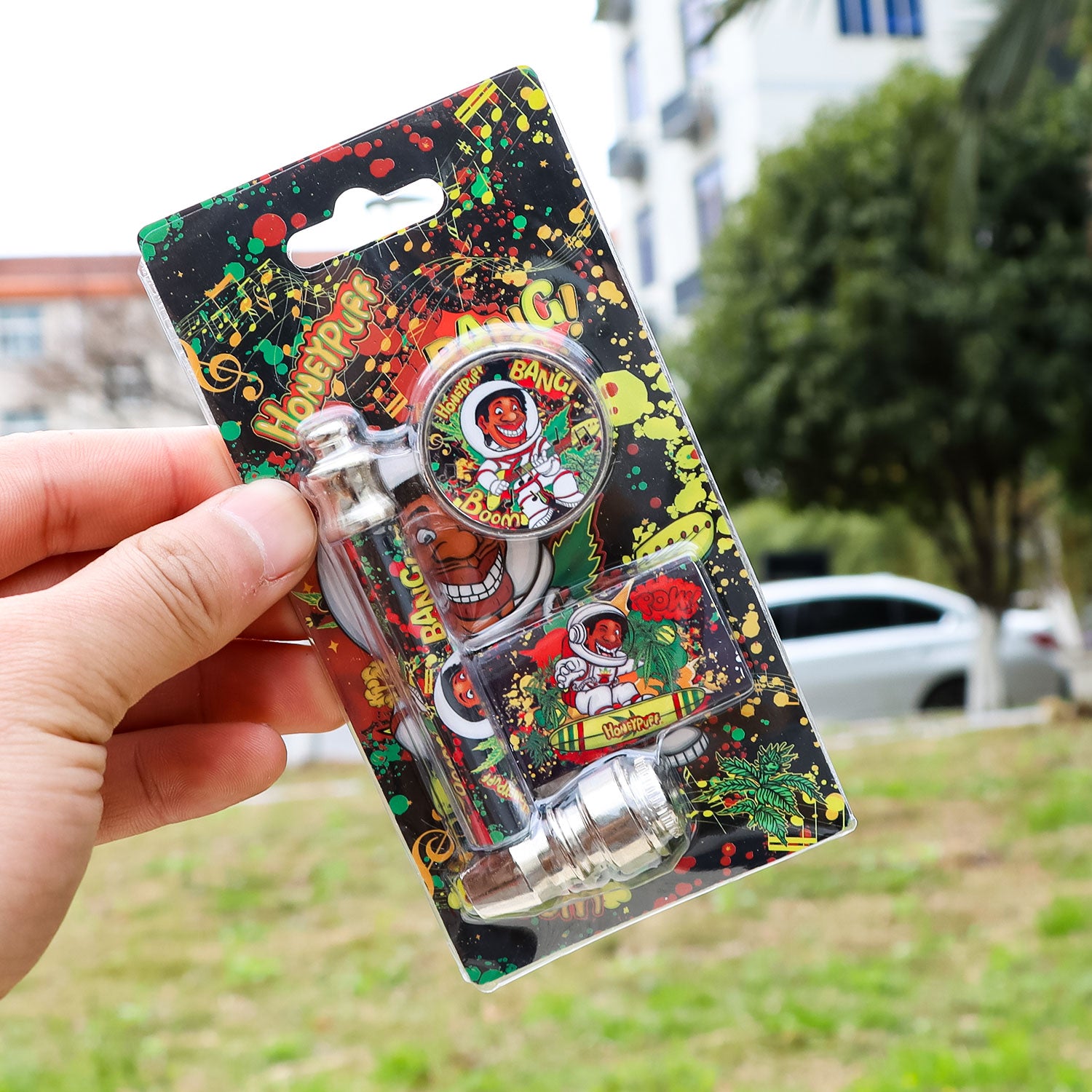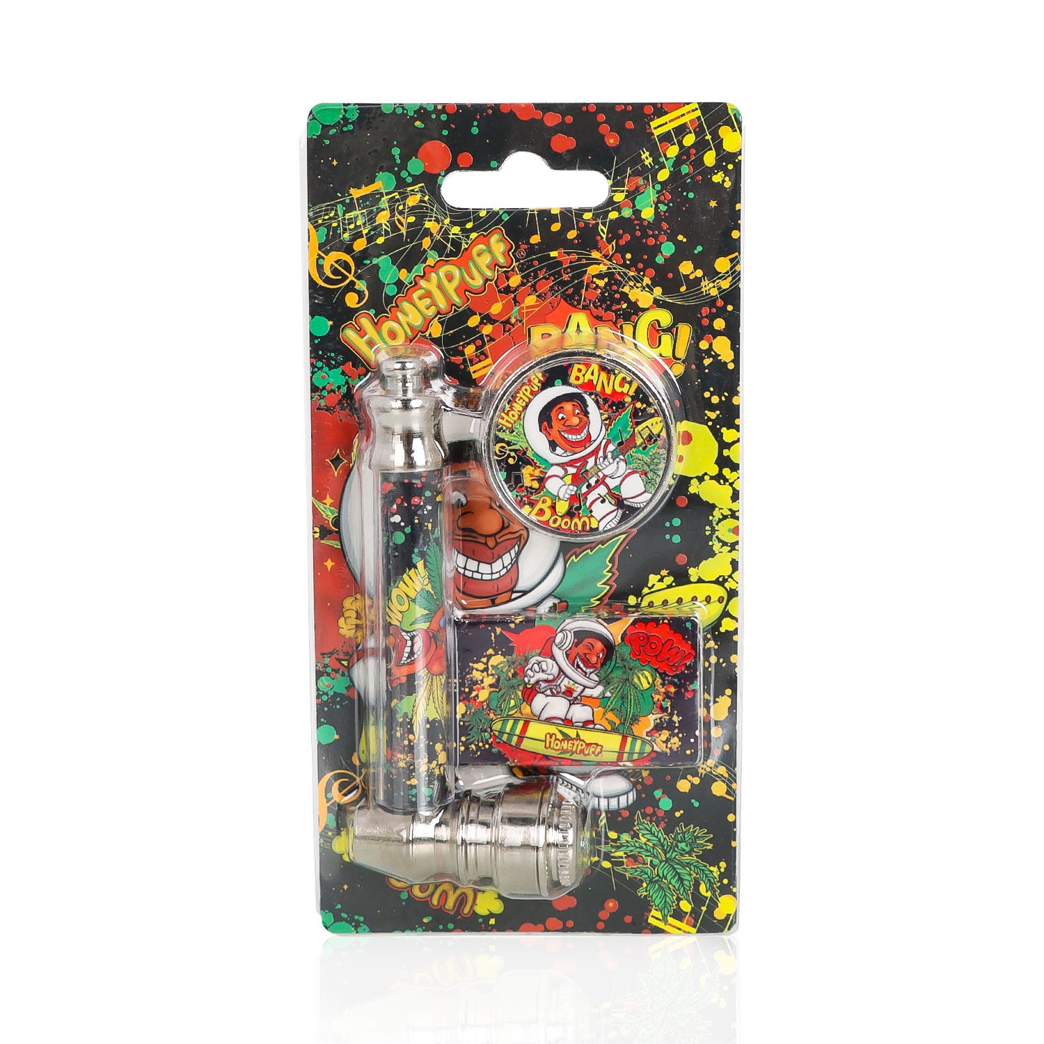 Honey Puff smoking pipe set include smoking pipe, herb grinder and metal screen in a sit.