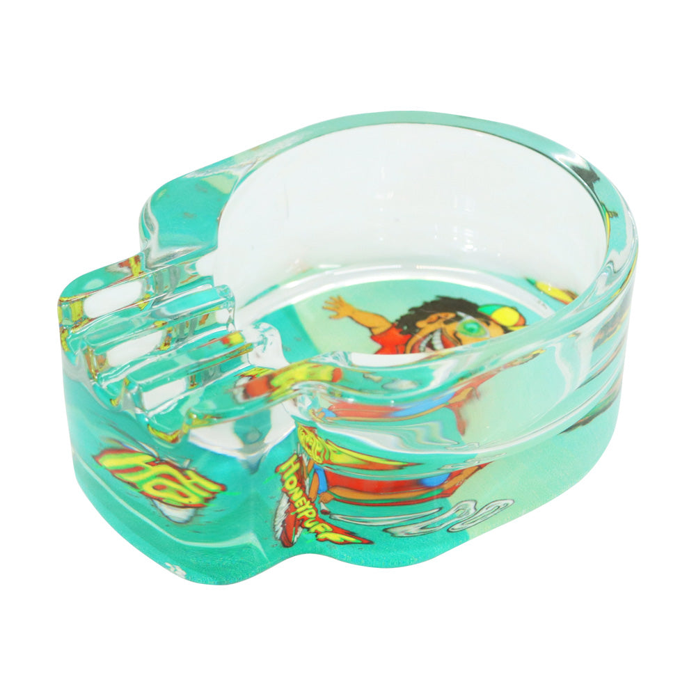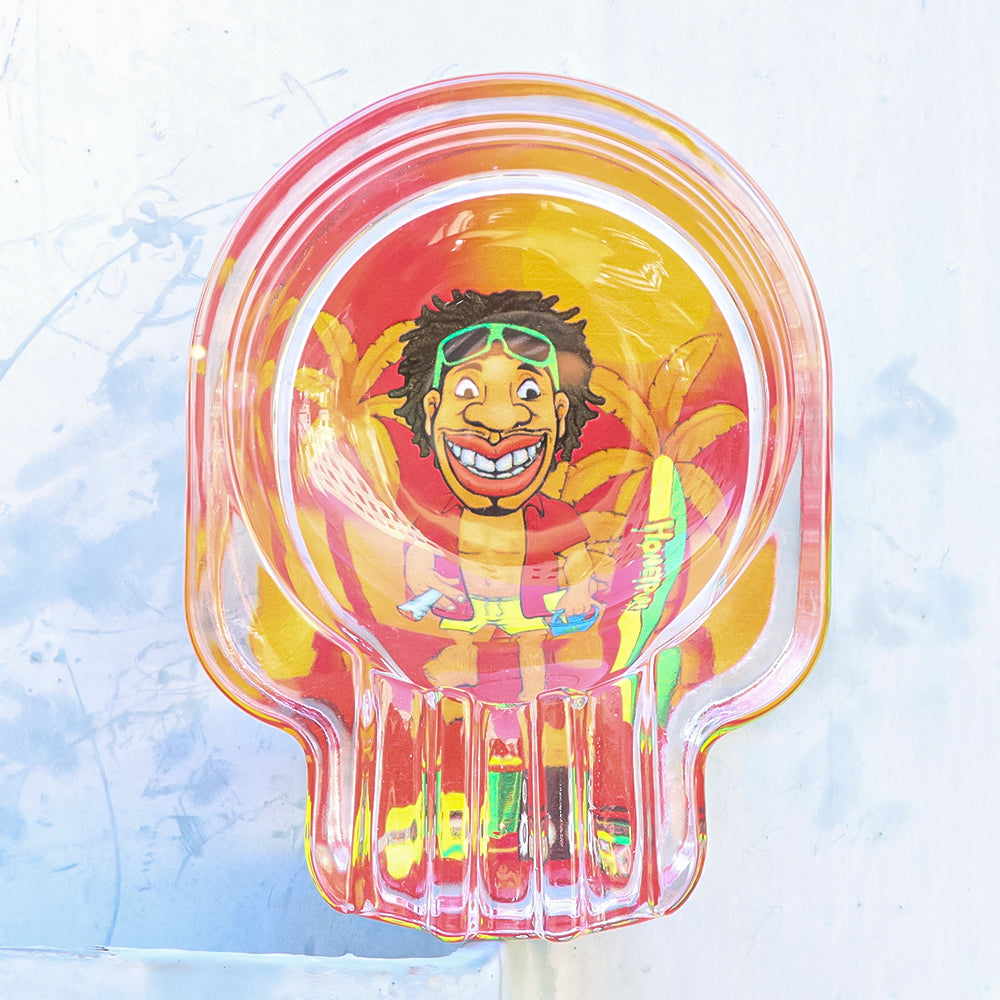- [Unique design]: The tobacco glass ash tray is a skull shape. Each of our cigarette ashtray have 3 slots in the edge taht can hold the cigarette convenience. The tobacco ash tray inside is 77*42, outside is 97*62, the weight is 270 gram. The an attached colorful paint linker at the bottom can reduce the sound of movement.