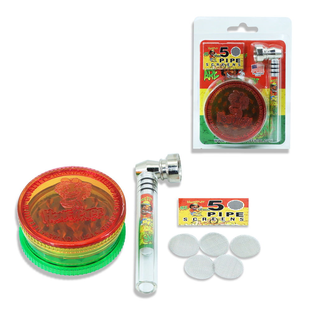 Honeypuff smoking kit with 60mm 3 parts plastic griner+glass pipe