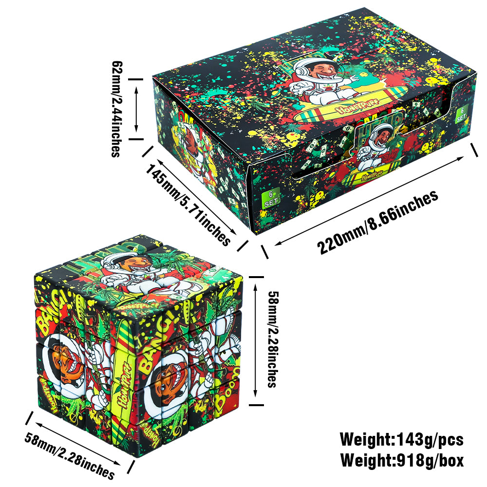 - [Portable and easy clean]: The cube tobacco grinder is 58 mm size and 157 grams, easily put it in pocket. So it is portable to take it anywhere and use it in anytime. The tobacco grinder internal is made of frosting aluminum alloy and also have a small plastic triangle scrape. The mental internal is smooth and corrosion resistance so you can clear it very comfortable.