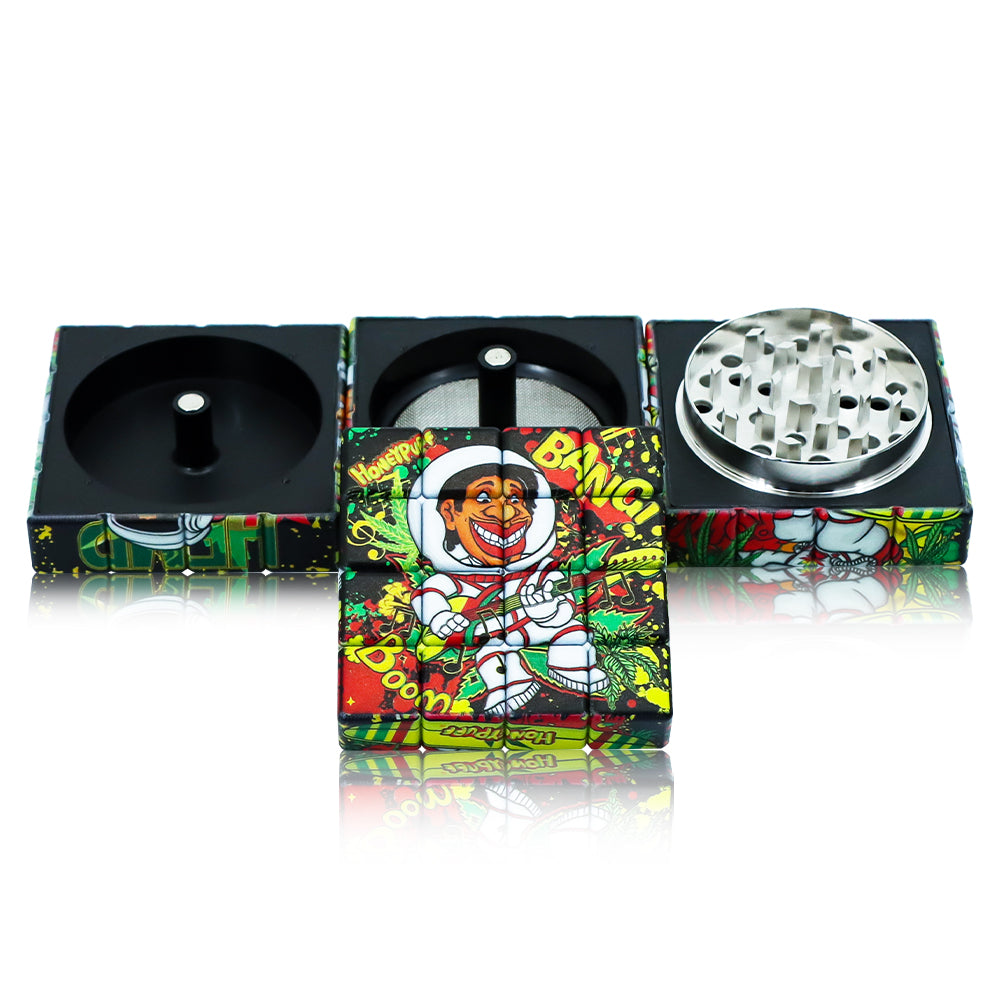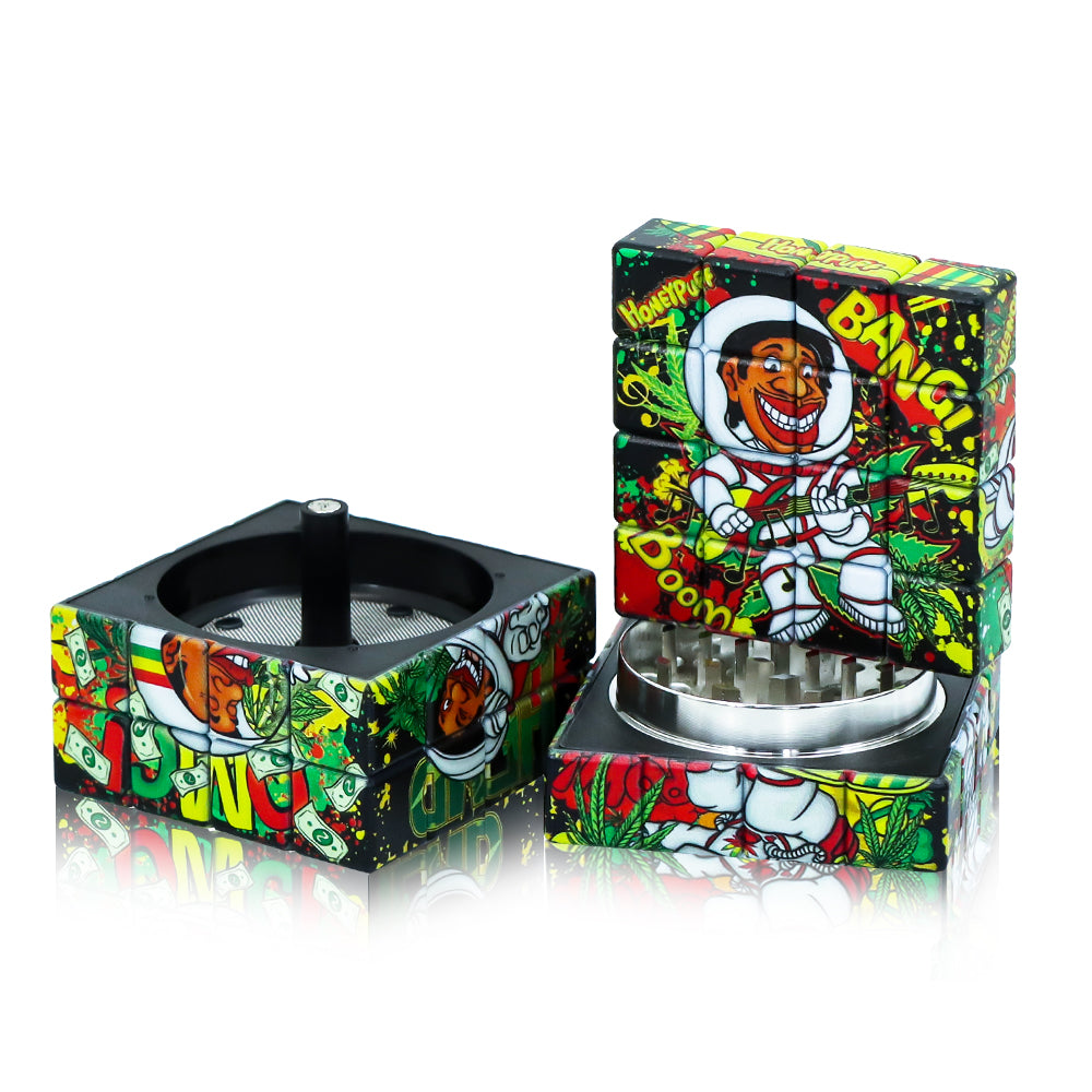 - [Functional tobacco grinder]: The tobacco grinder compose with plastic shell and zinc alloy teeth. The cube herb grinder have 4 lays. First piece is magnet lid and aluminum alloy sharp teeth. Second piece also equip metal sharp teeth, beside it have some circular filter hole to next space. Third piece is store space and small filter screen. Fourth piece store powder which come from third place grinding charge, and include plastic triangle scraper.