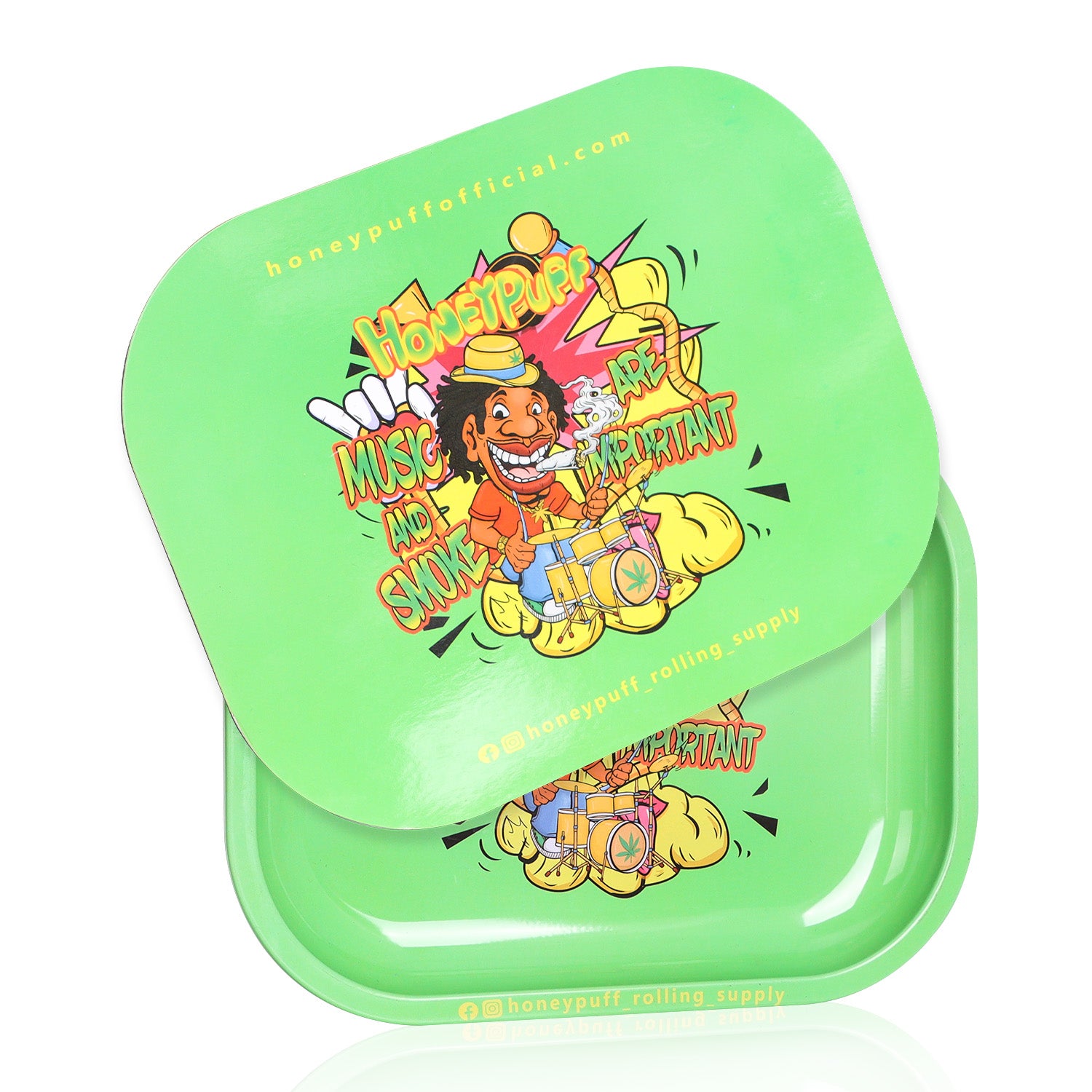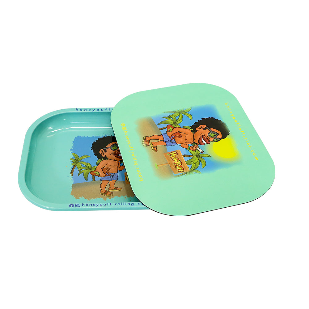 HONEYPUFF Green Tinplate Metal Rolling Tray, Soft Magnetic Lid Cigarette Rolling Tray, Smooth Rounded Edge Rolling Paper Tray, 7” x 5.5” Small Size Portable Rolling Trays